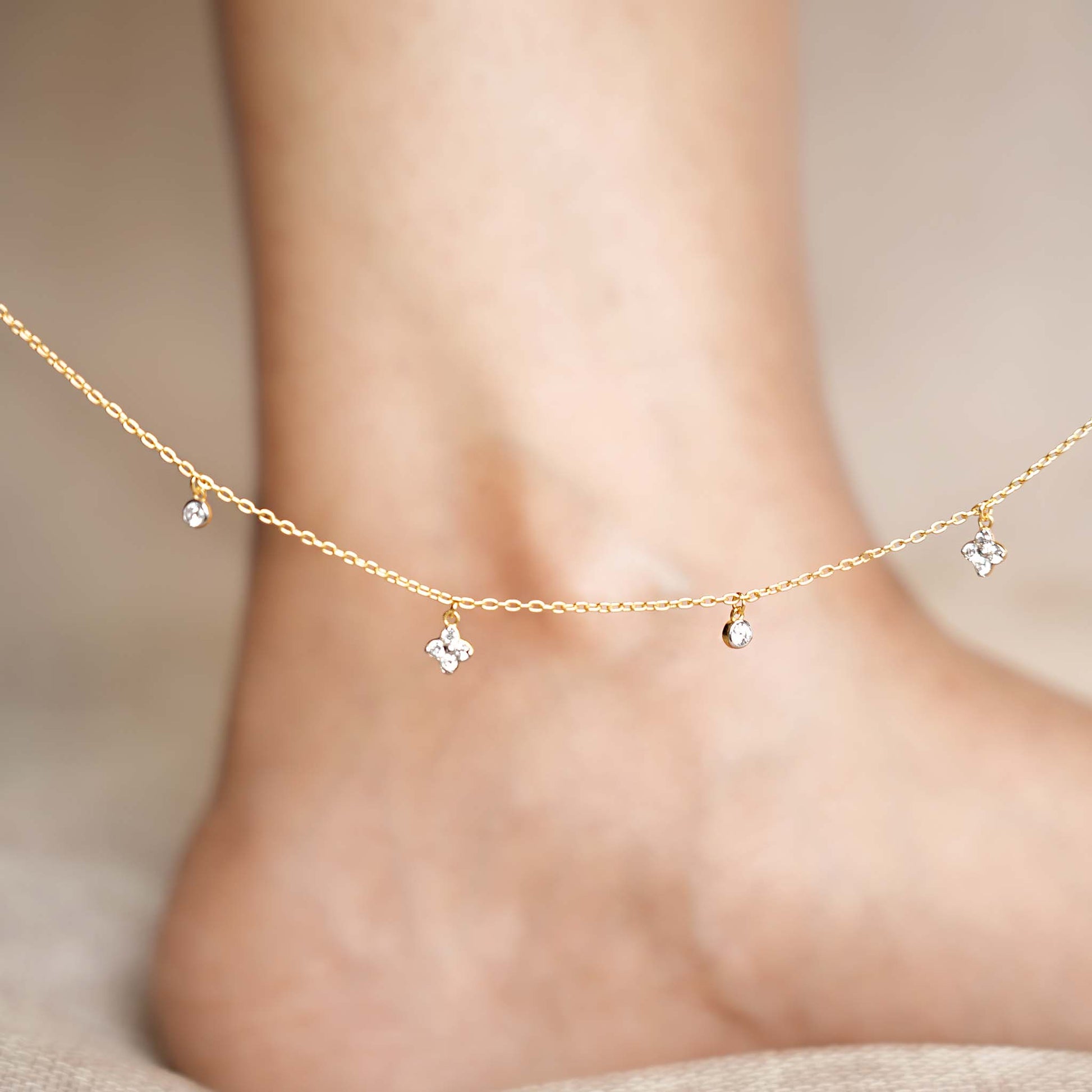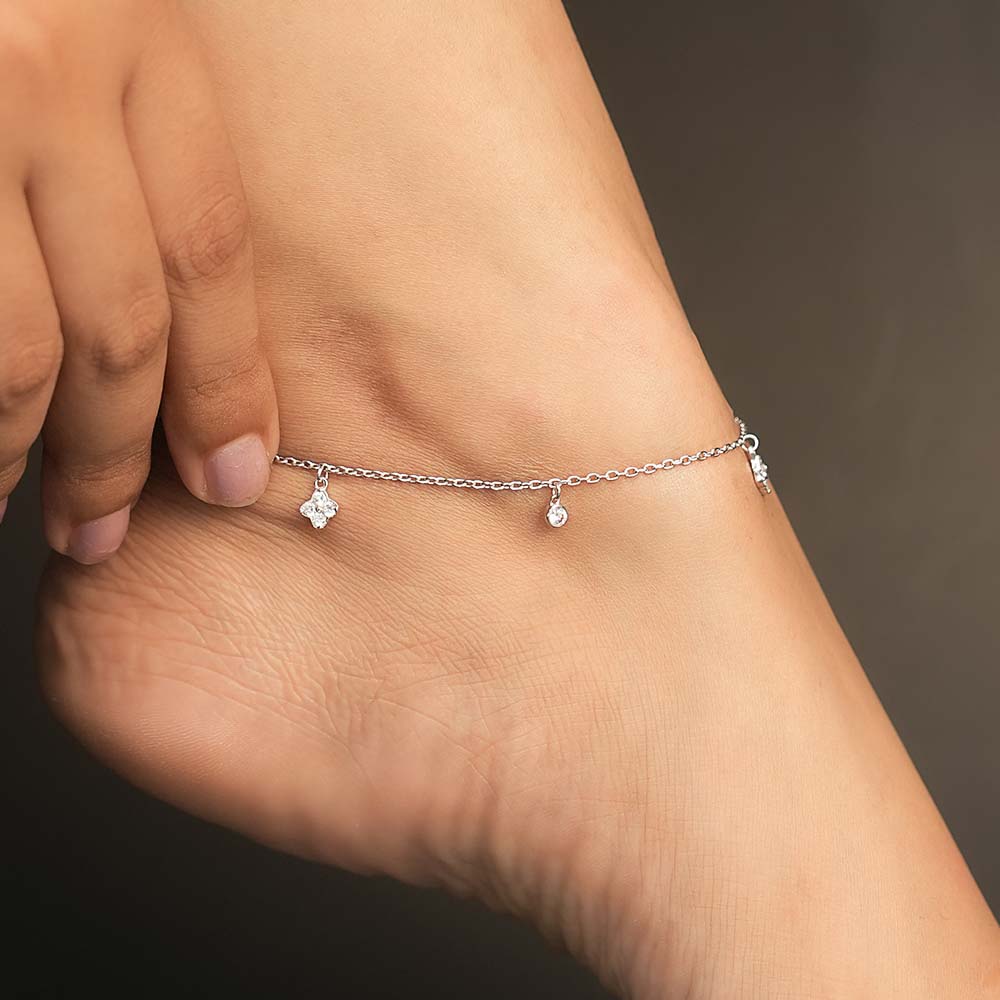 Soft, breezy, and effortlessly elegant—this anklet features dainty zircon drops that shimmer like scattered moonlight. Chaaya, meaning a gentle glow or shadow, beautifully captures its dreamy charm. Handcrafted in 92.5 Sterling Silver and studded with 5A+ Austrian Zircon diamonds.