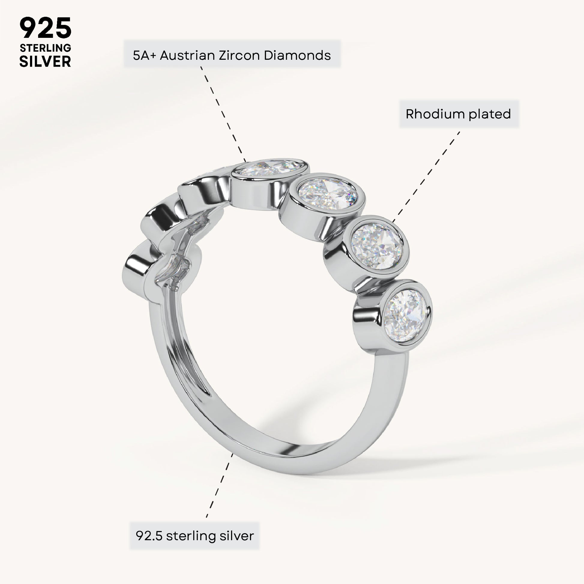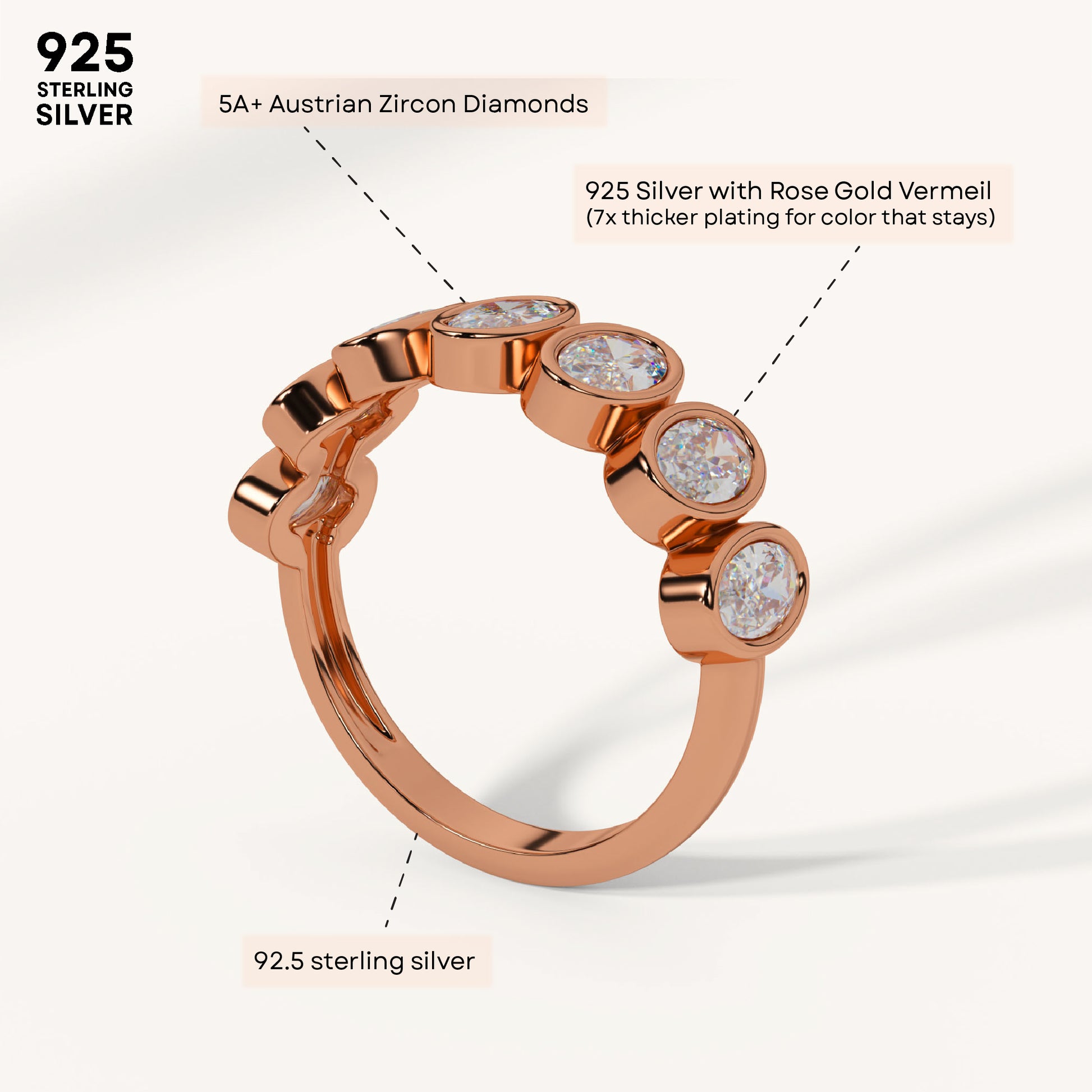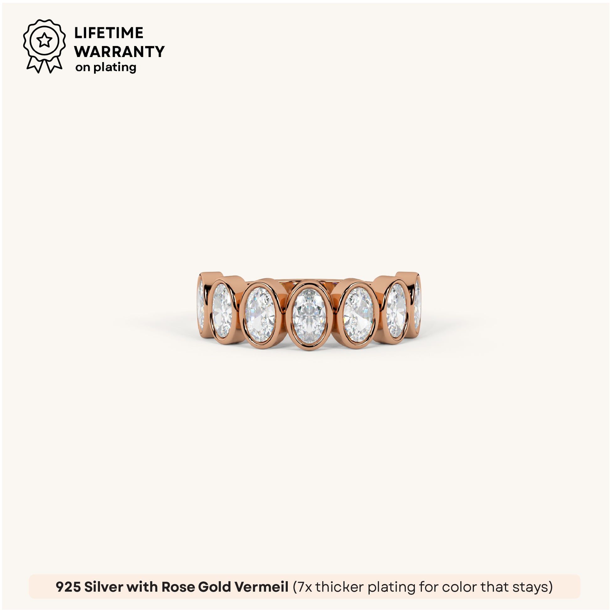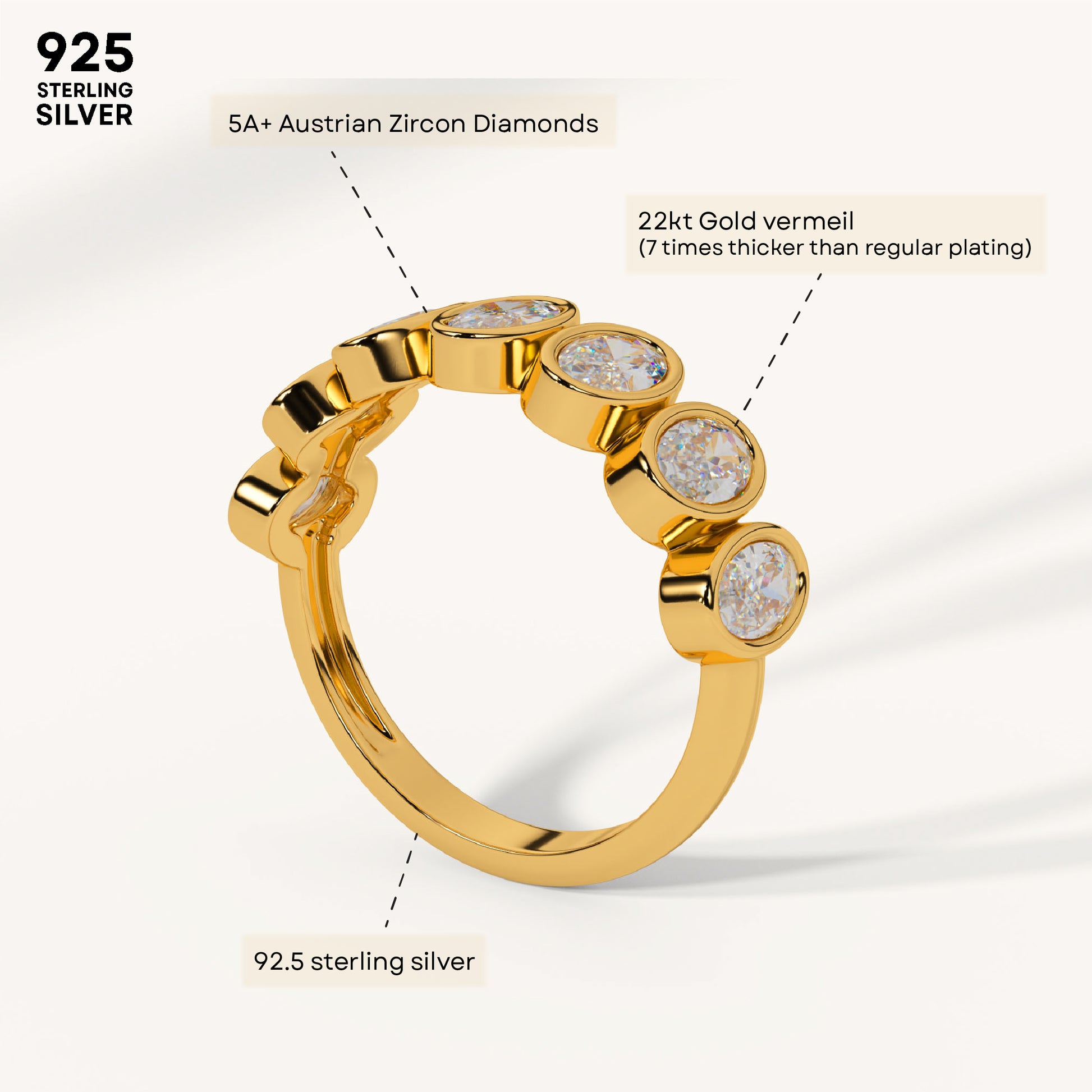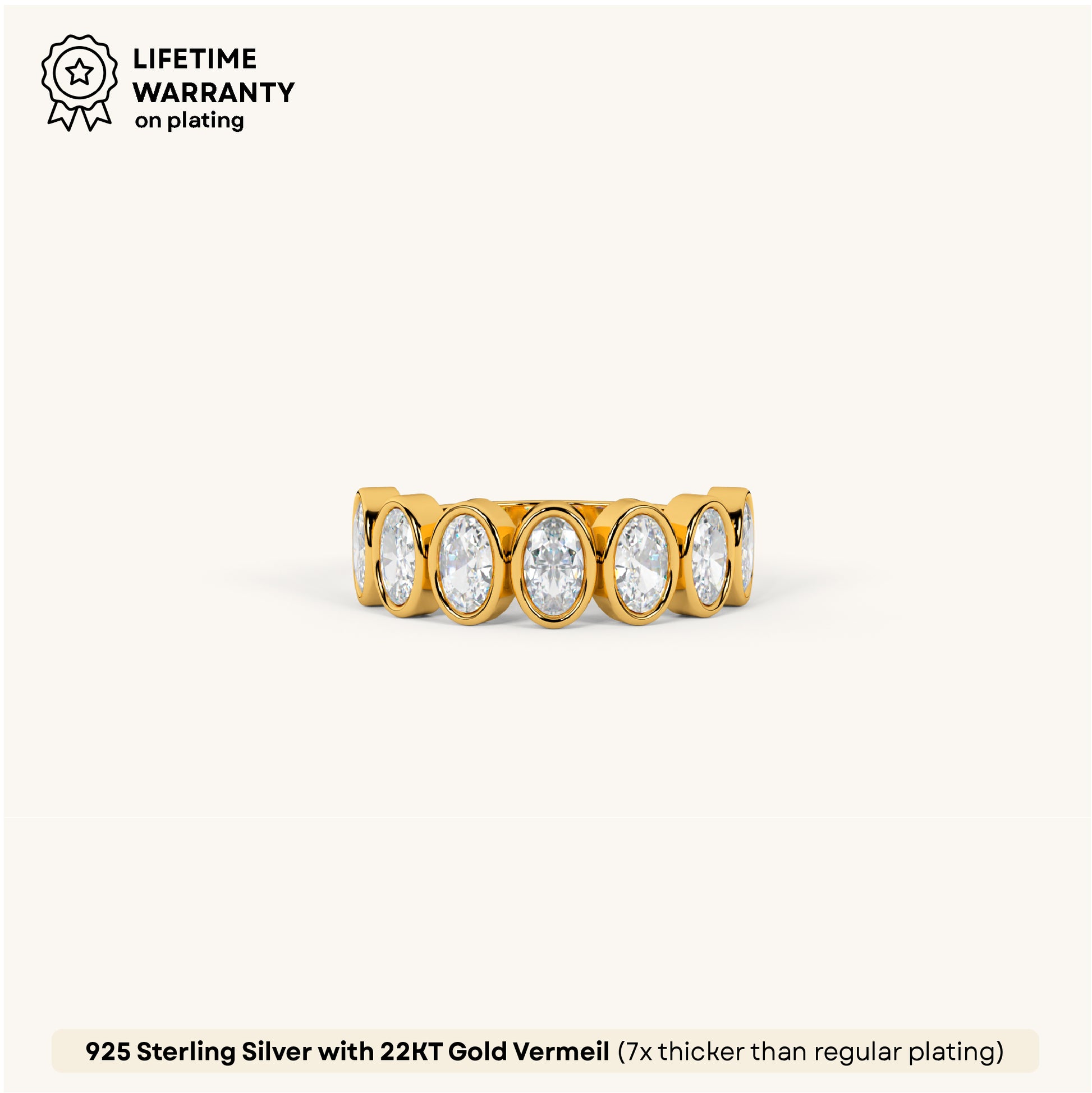 Timeless bezel-set band ring with 5A+ Austrian Zircon diamonds. Crafted in 92.5 Sterling Silver, Plated 22k gold Vermeil with 7x thicker coating for unmatched brilliance and durability.