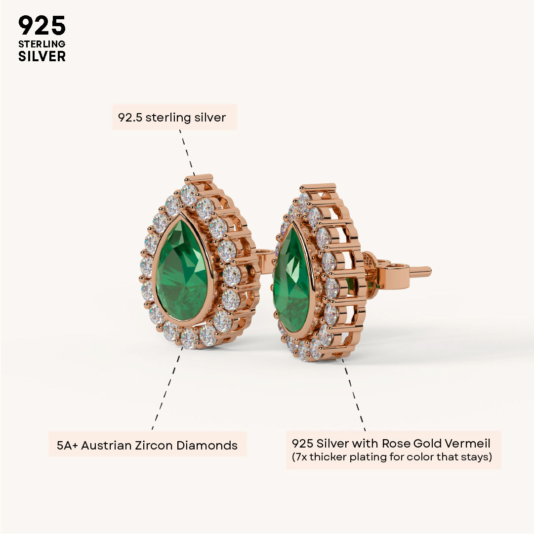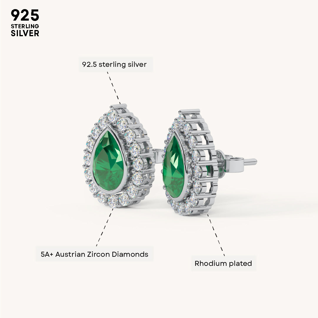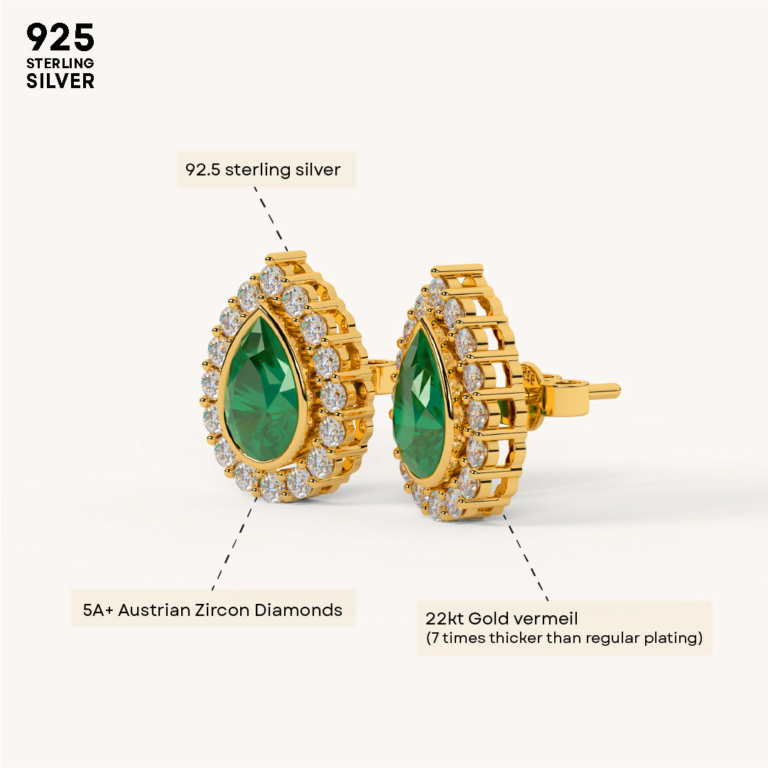 These elegant studs showcase a stunning pear-shaped emerald at the center, surrounded by a radiant cluster of stones. Crafted from premium 92.5 Sterling Silver and finished with a 22k Gold Vermeil 7x thicker coating, these earrings exude luxury. The surrounding cluster is studded with best 5A+ Austrian Zircon diamonds, providing a magnificent sparkle that perfectly complements the vibrant green of the emerald.Â