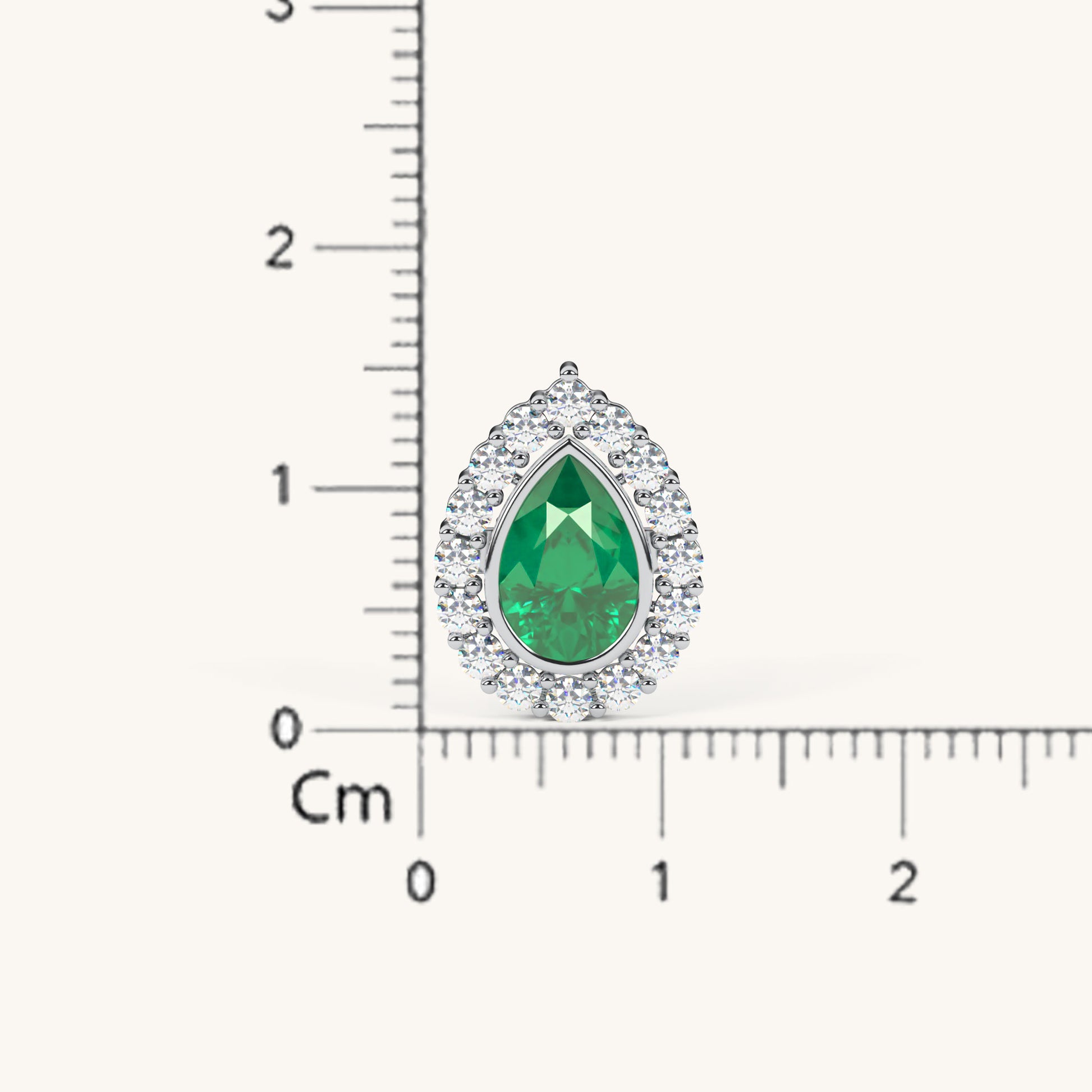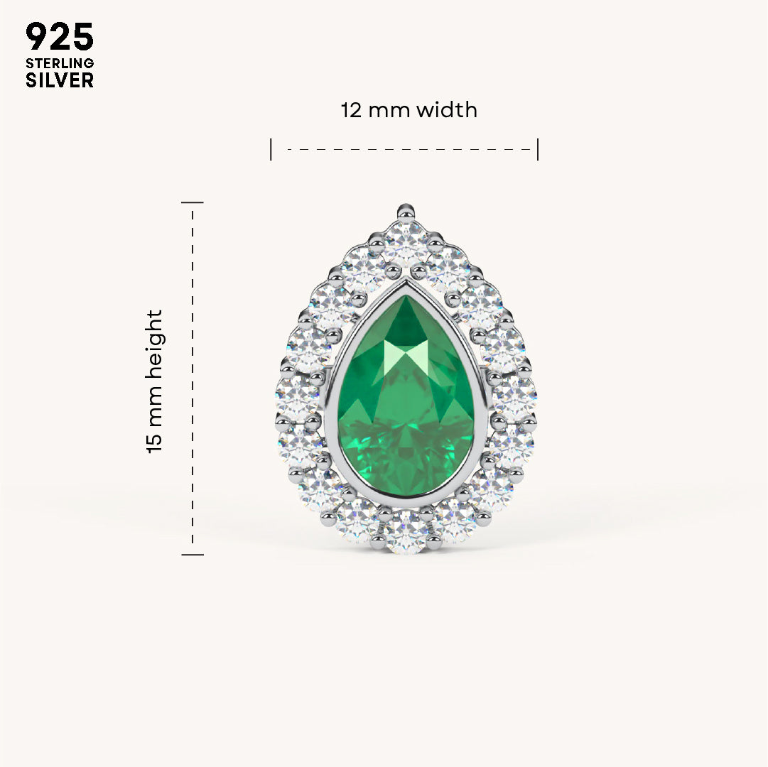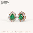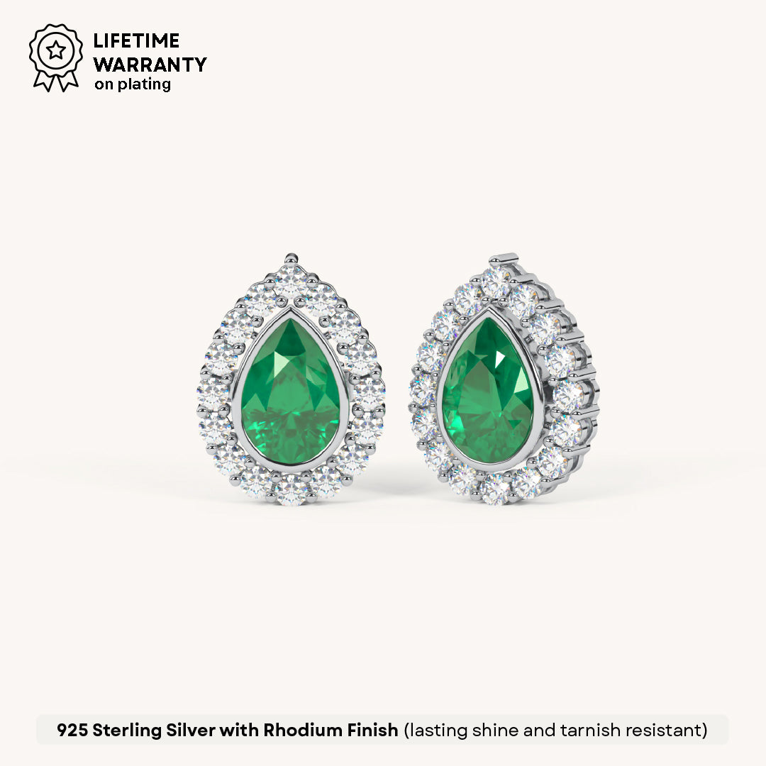 These elegant studs showcase a stunning pear-shaped emerald at the center, surrounded by a radiant cluster of stones. Crafted from premium 92.5 Sterling Silver and finished with a 22k Gold Vermeil 7x thicker coating, these earrings exude luxury. The surrounding cluster is studded with best 5A+ Austrian Zircon diamonds, providing a magnificent sparkle that perfectly complements the vibrant green of the emerald.Â