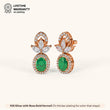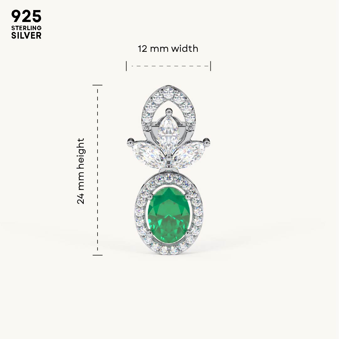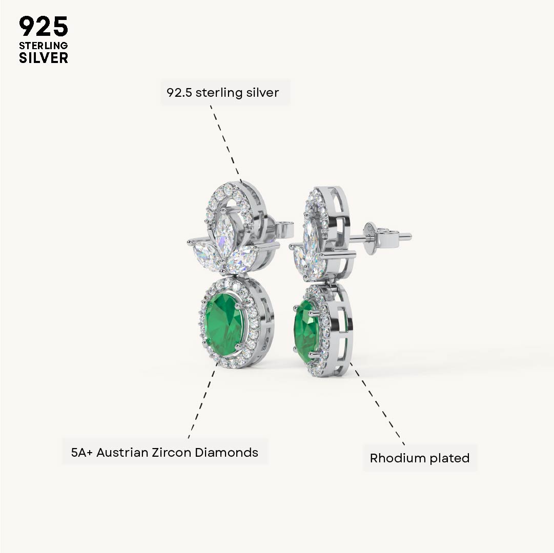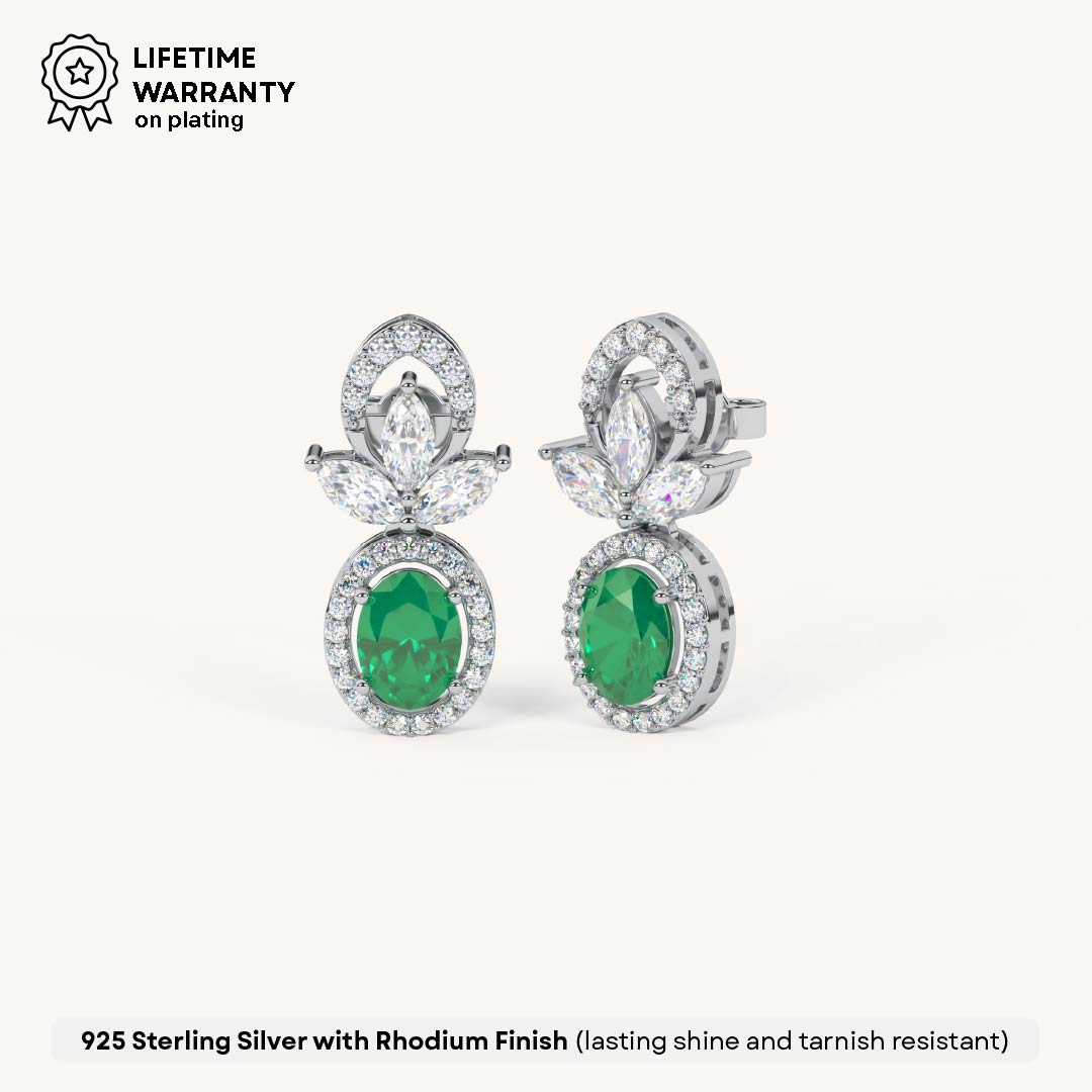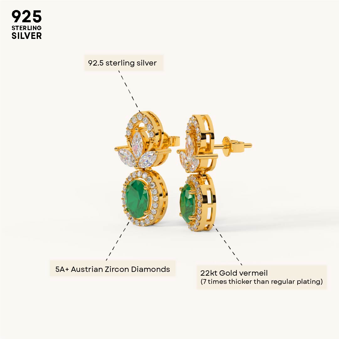 Designed with timeless charm, these earrings showcase a floral-inspired top with an oval green stone surrounded by shimmering zircons. Crafted in 92.5 Sterling Silver, plated with 22k Gold Vermeil with 7x thicker coating and studded with best 5A+ Austrian Zircon diamonds.
