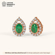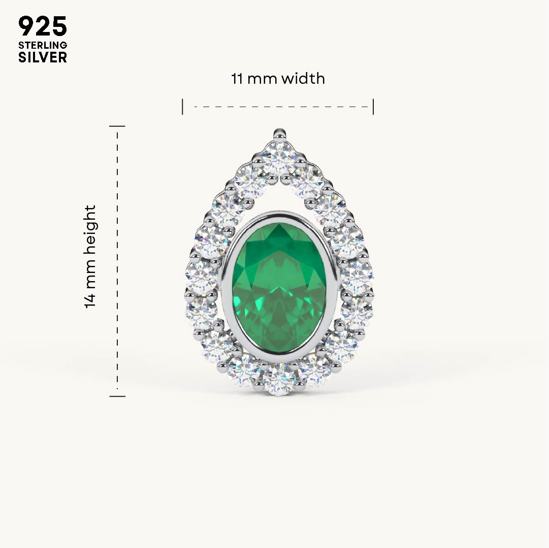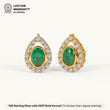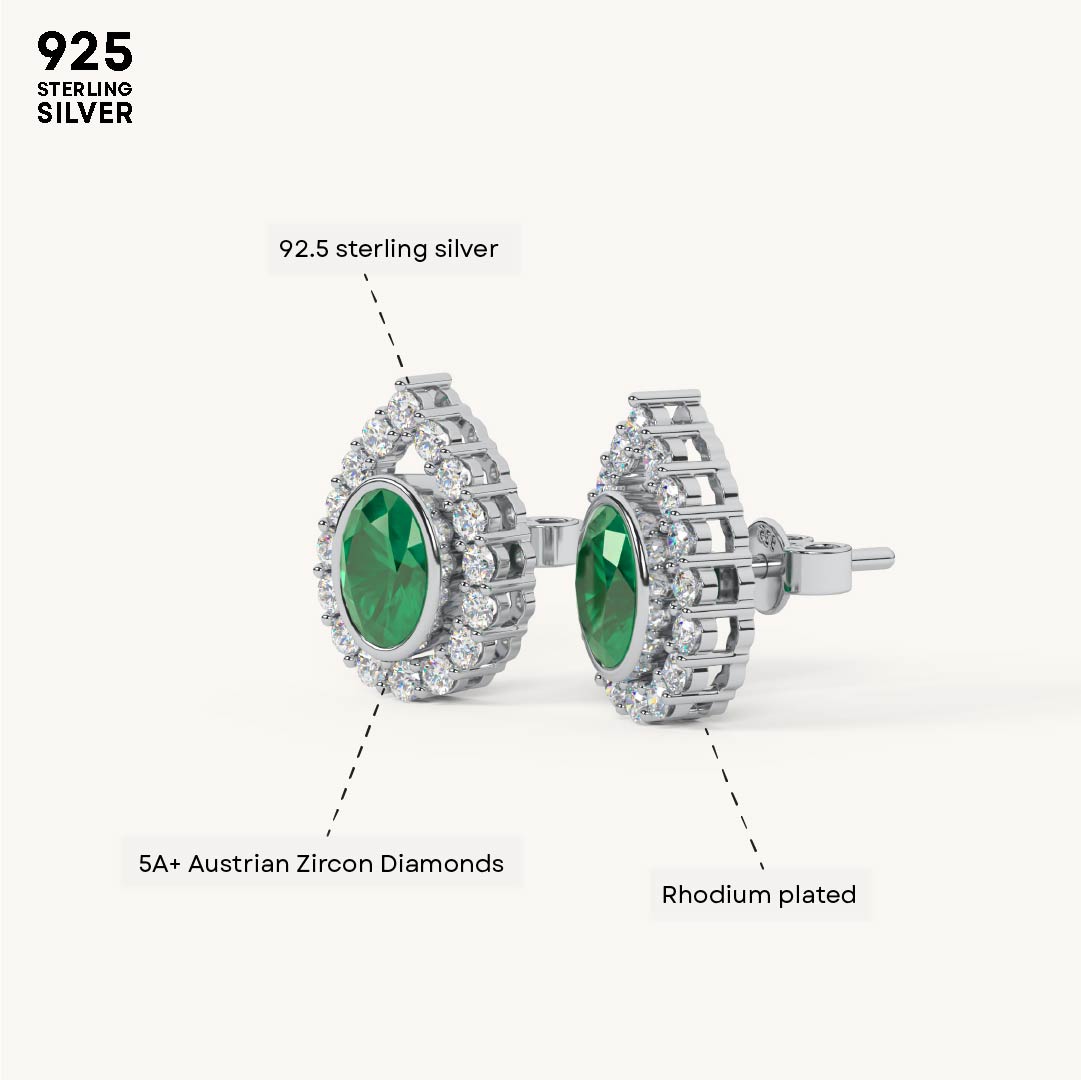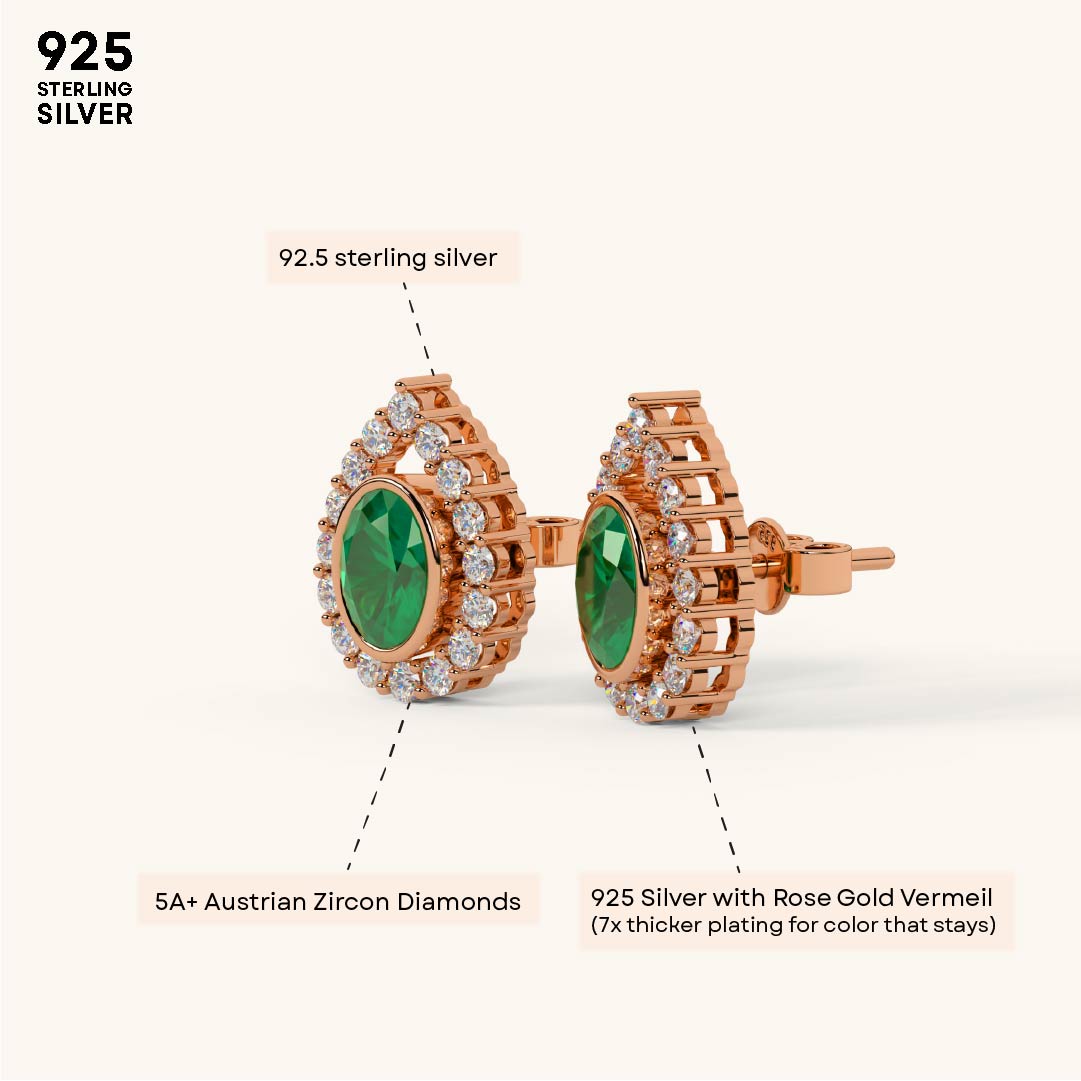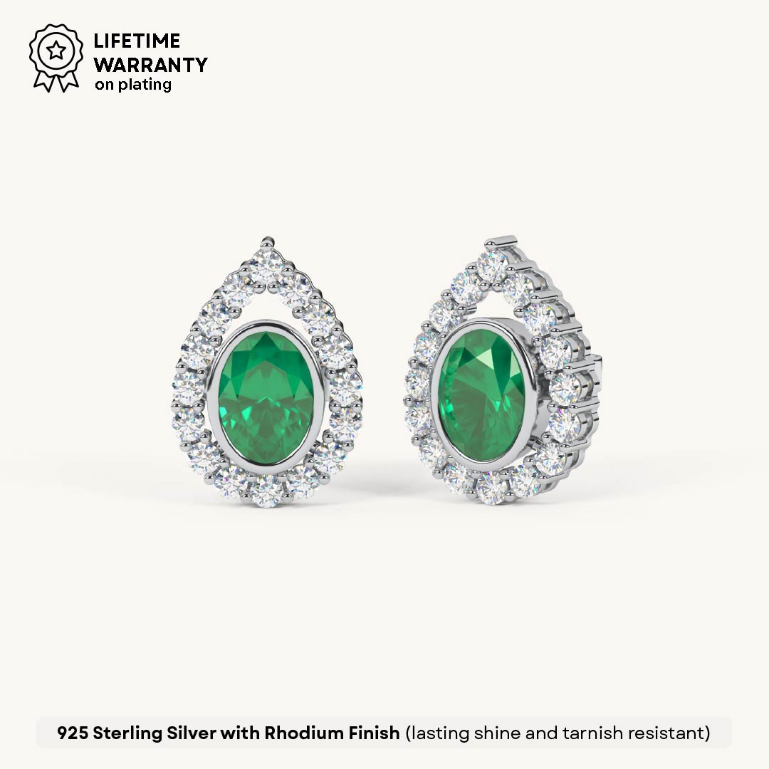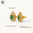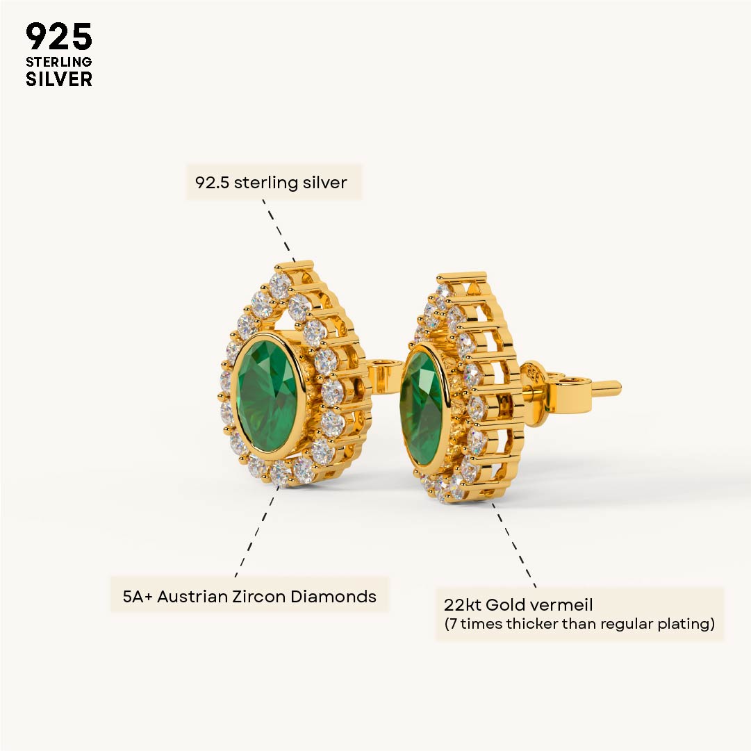 Designed in an elegant pear shape, these earrings feature a sparkling diamond-studded outline with a vivid emerald stone at the center. Crafted in 92.5 Sterling Silver, plated with 22k Gold Vermeil (7x thicker coating), and studded with best 5A+ Austrian Zircon diamonds.