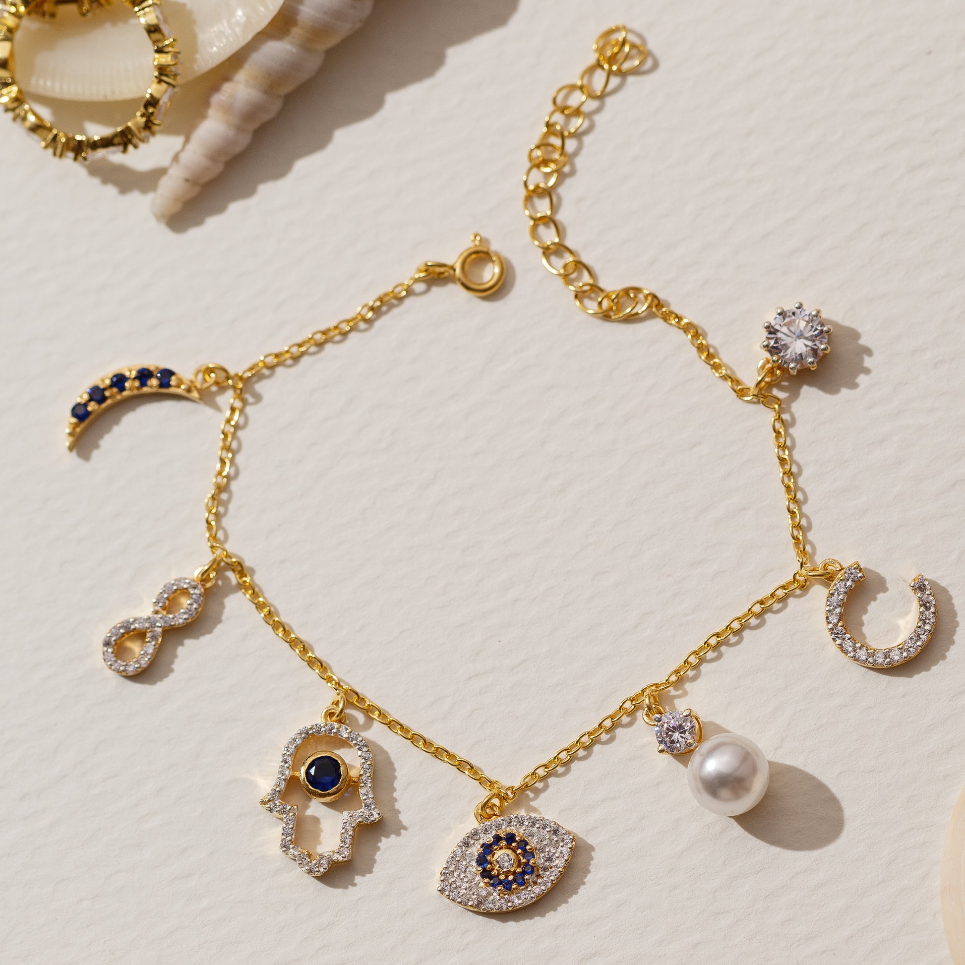 - A gold chain featuring diverse symbolic charms all gold plated and studded with 5A+ Austrian Zircon Diamonds, make for this beautiful charm bracelet.