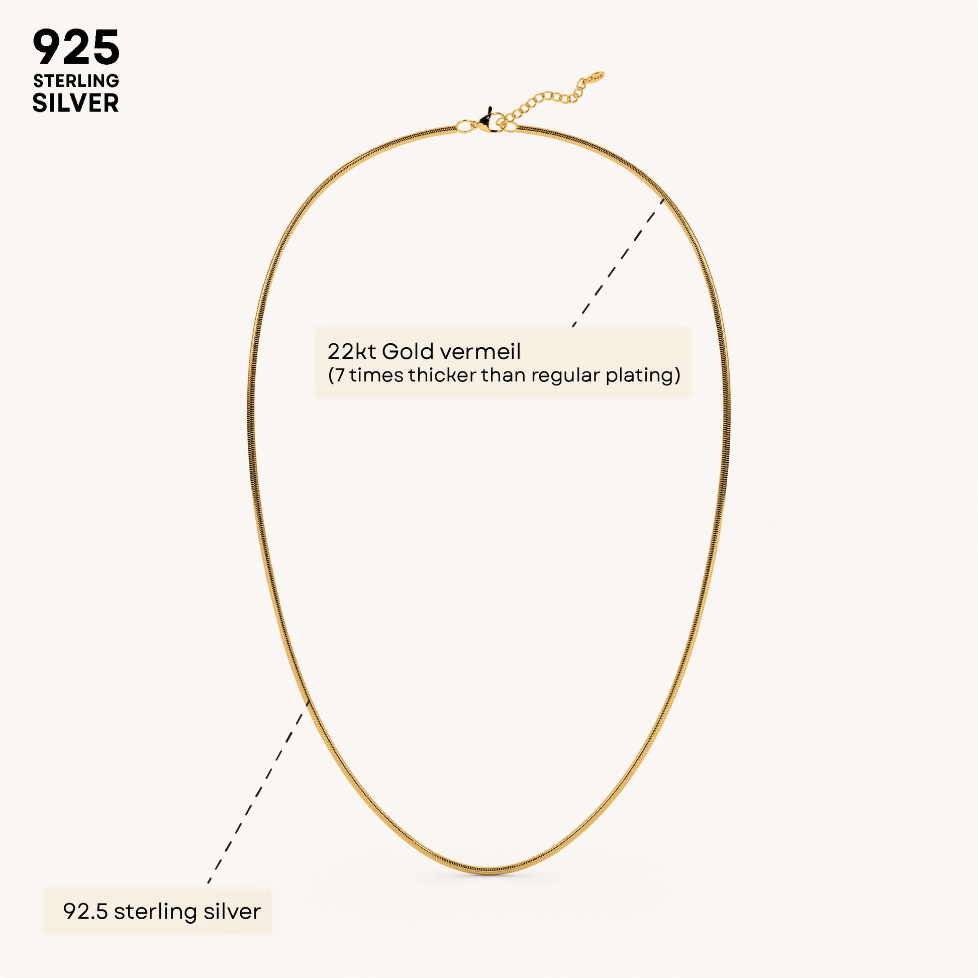 Obsessed with this sleek baddie! Gold Gleam Snake Chain gives rich minimal energy. Made in 92.5 Sterling Silver, plated in 22k Gold Vermeil with 7x thicker coating, and finished to perfection. No cap, it's a forever flex.