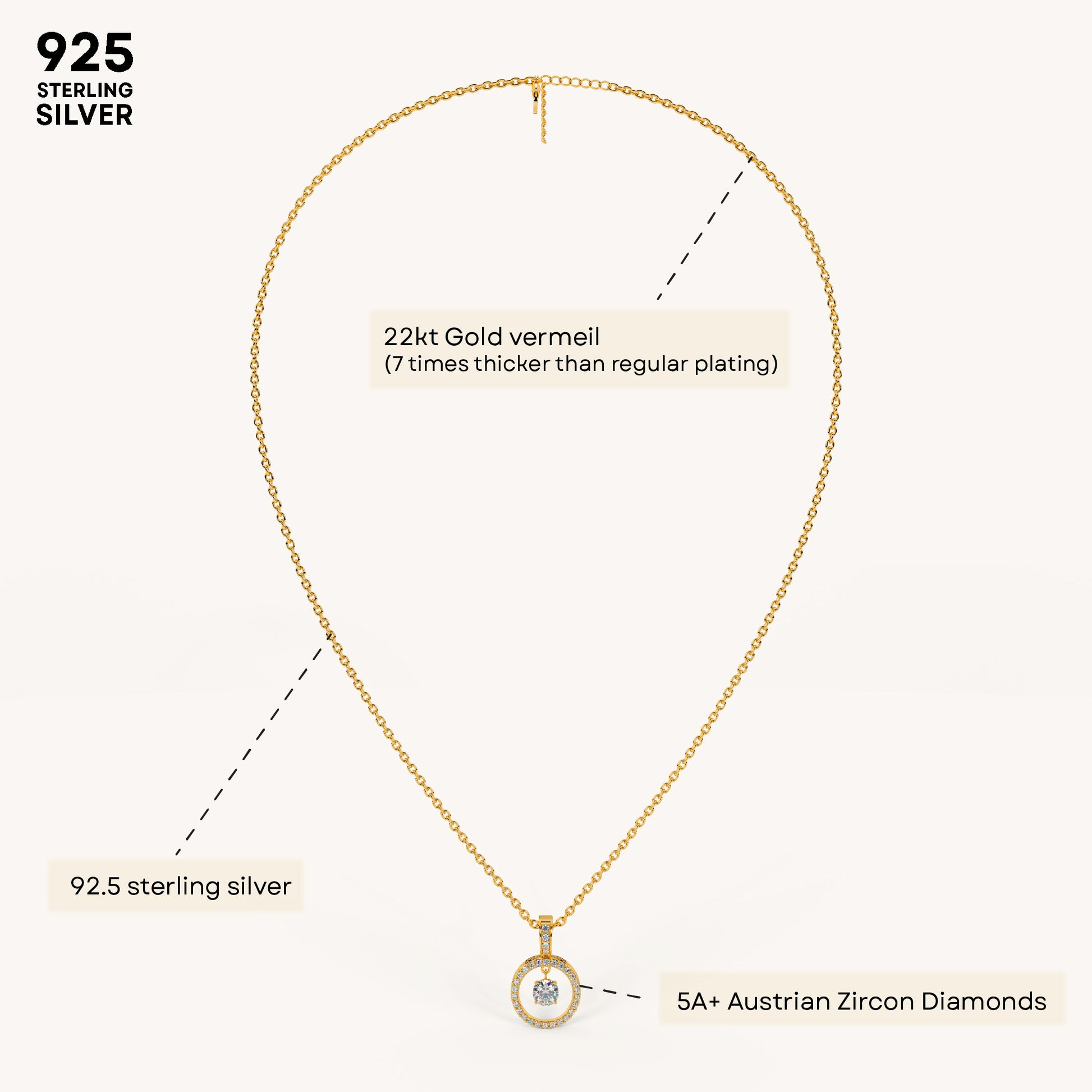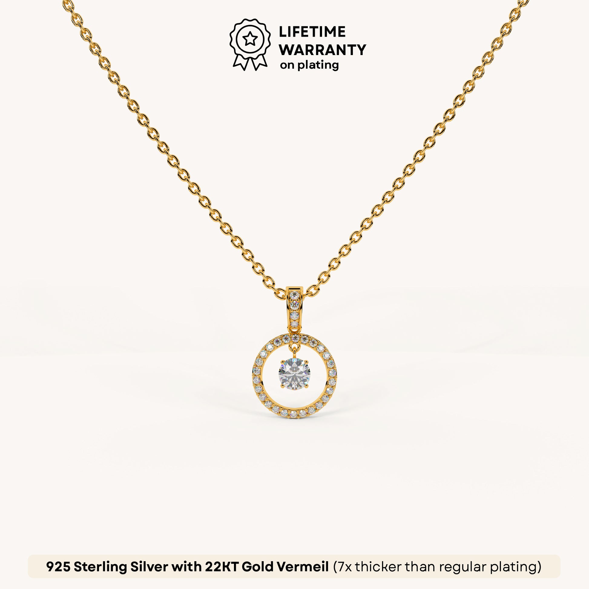 Radiating timeless brilliance, this pendant adds a refined glow to any neckline—perfect for daily elegance or special moments. Crafted in 92.5 Sterling Silver, Plated 22k gold Vermeil with 7x thicker coating and studded with best 5A+ Austrian Zircon diamonds.