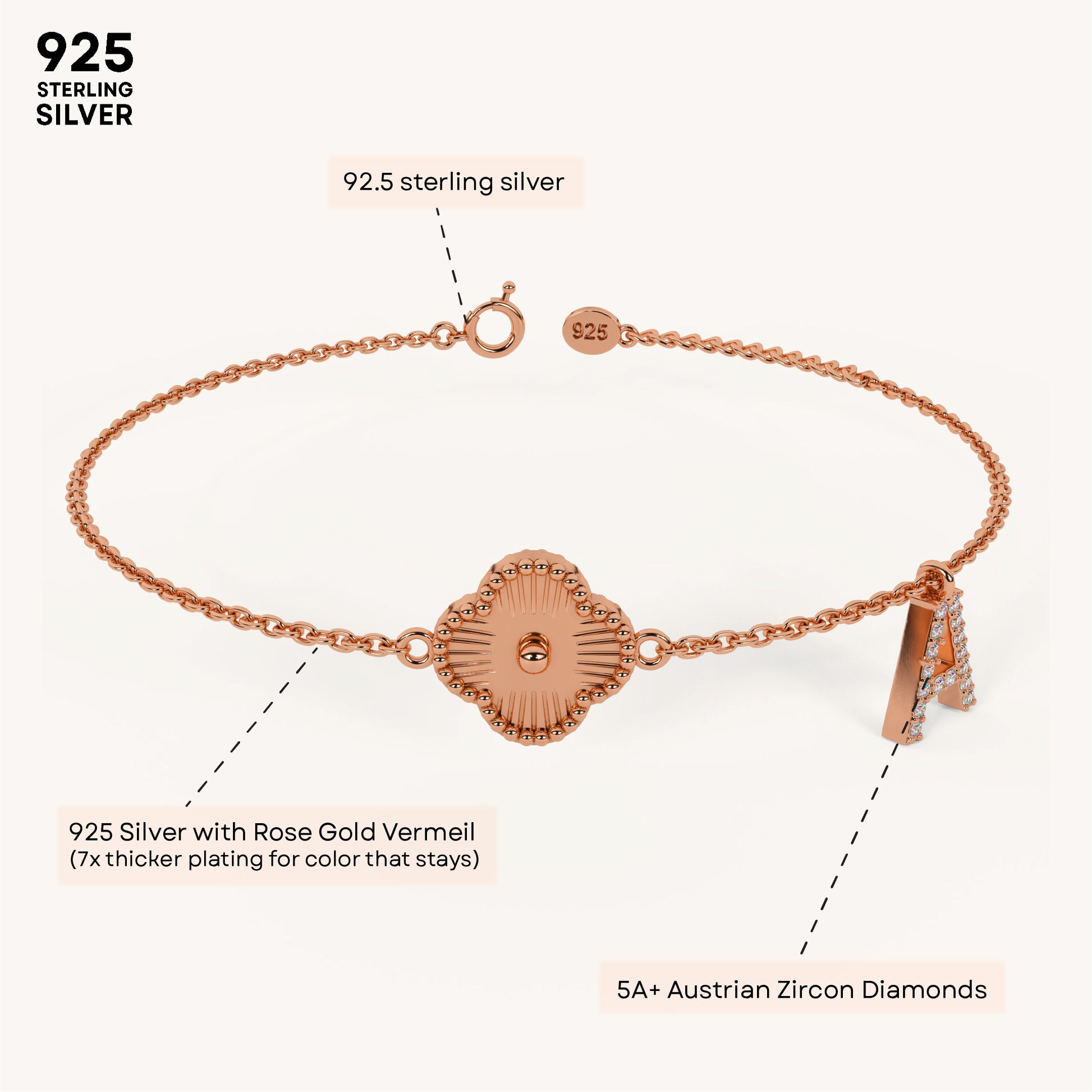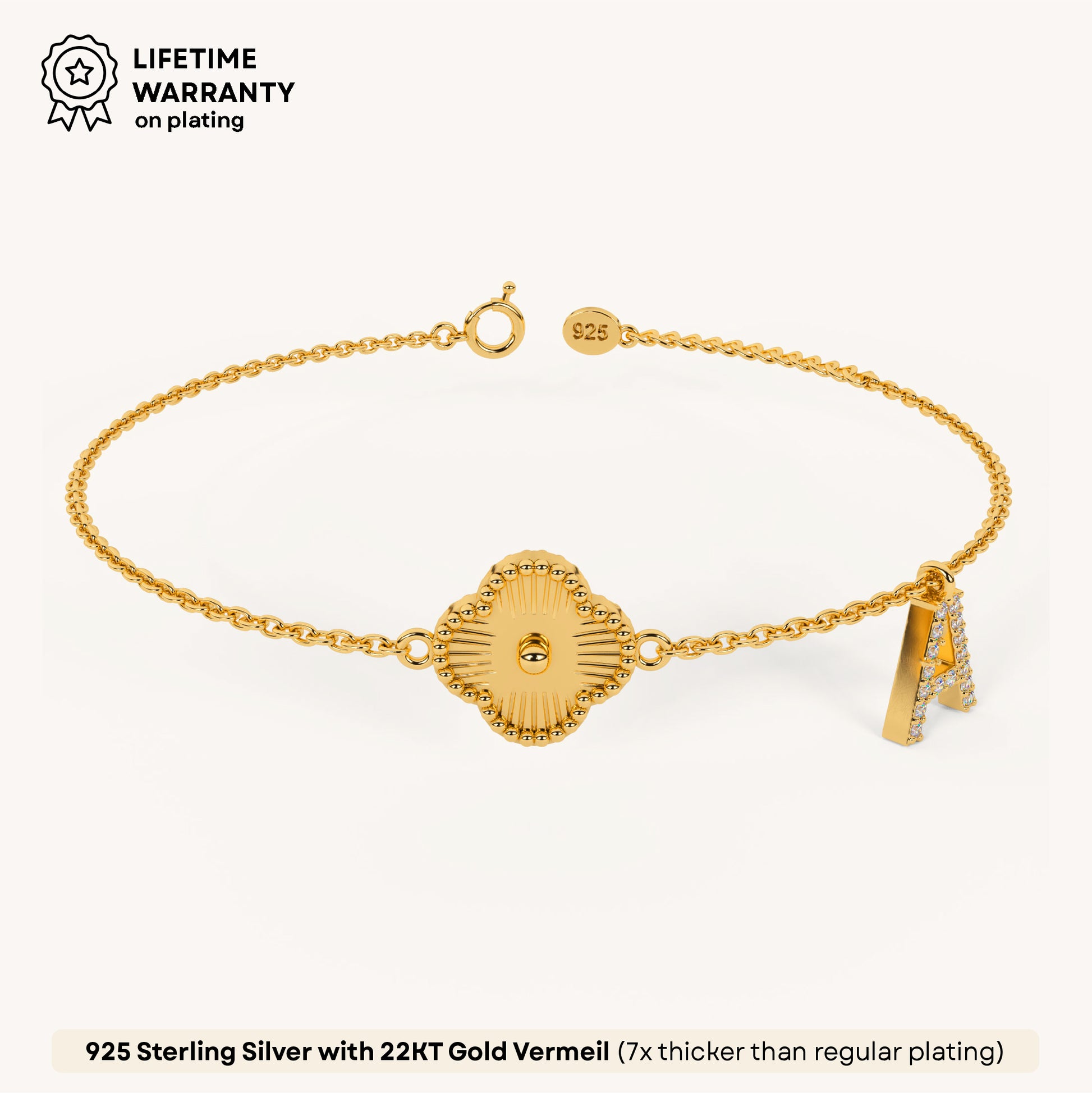 The Hope Initial Clover Bracelet is a symbol of love, luck, and positivity. Featuring a delicate clover charm and a personalized initial, it represents heartfelt connections. Crafted in 92.5 sterling silver, plated in 22k gold vermeil with 7x thicker coating and adorned with 5A+ Austrian zircon diamonds, it's a timeless token of affection.