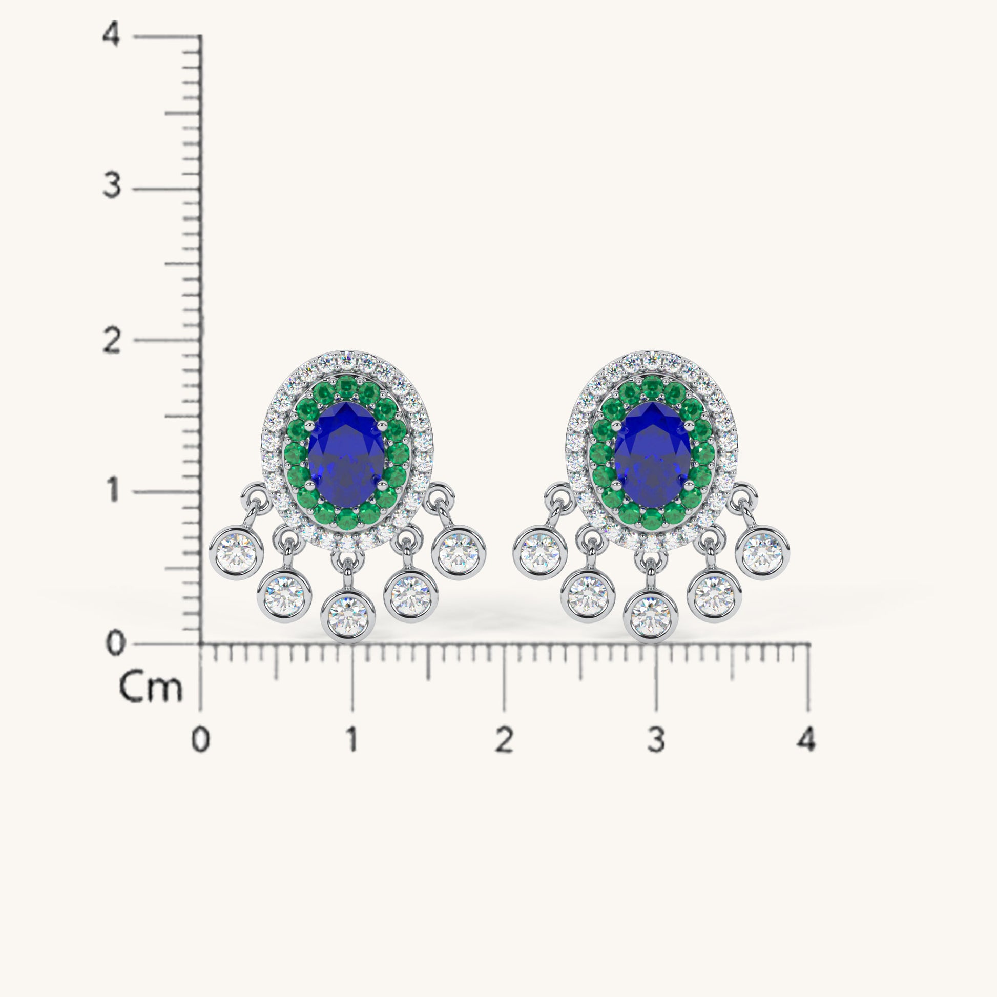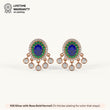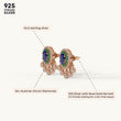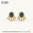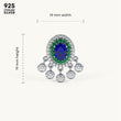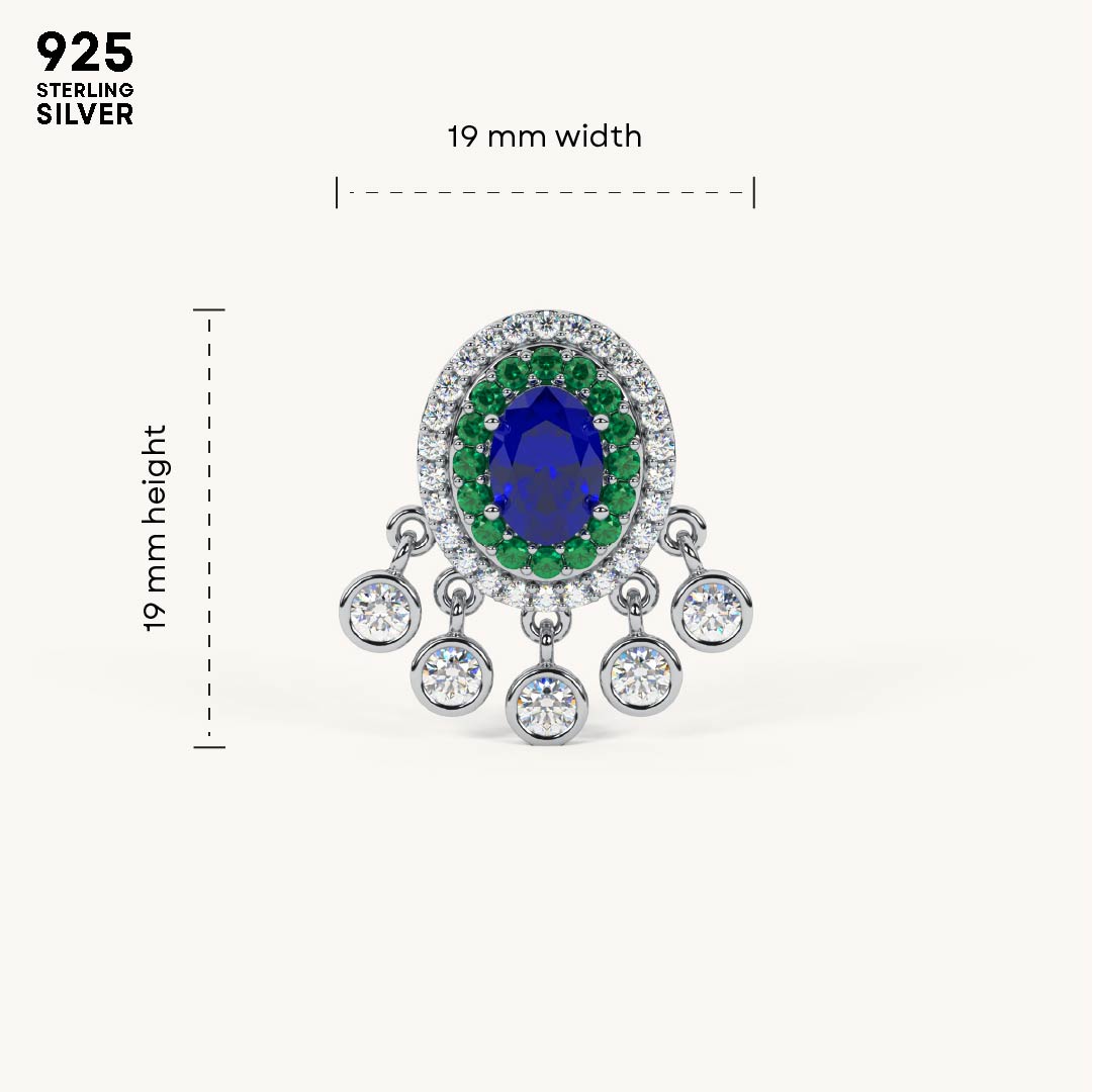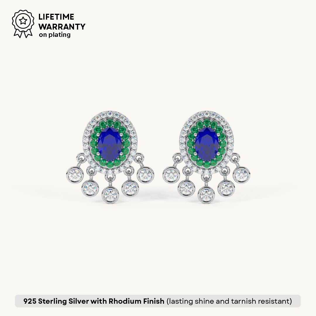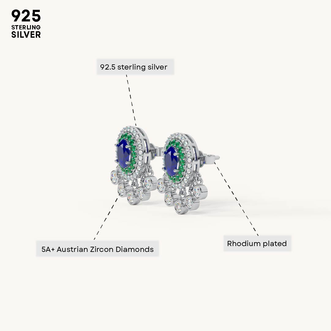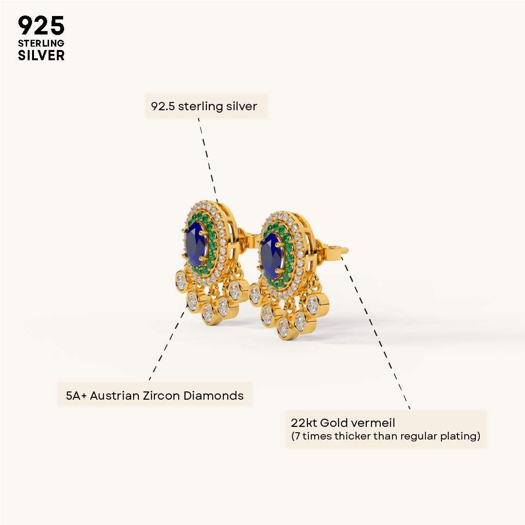 These beautiful drop earrings are crafted from 92.5 Sterling Silver and feature a striking oval blue center stone surrounded by a halo of green stones. A decorative fringe of sparkling 5A+ Austrian Zircon diamonds hangs below, creating a captivating sparkle. The earrings are finished with a luxurious 22kt Gold Vermeil coating, which is a 7x thicker coating than regular plating, for a durable and radiant finish.