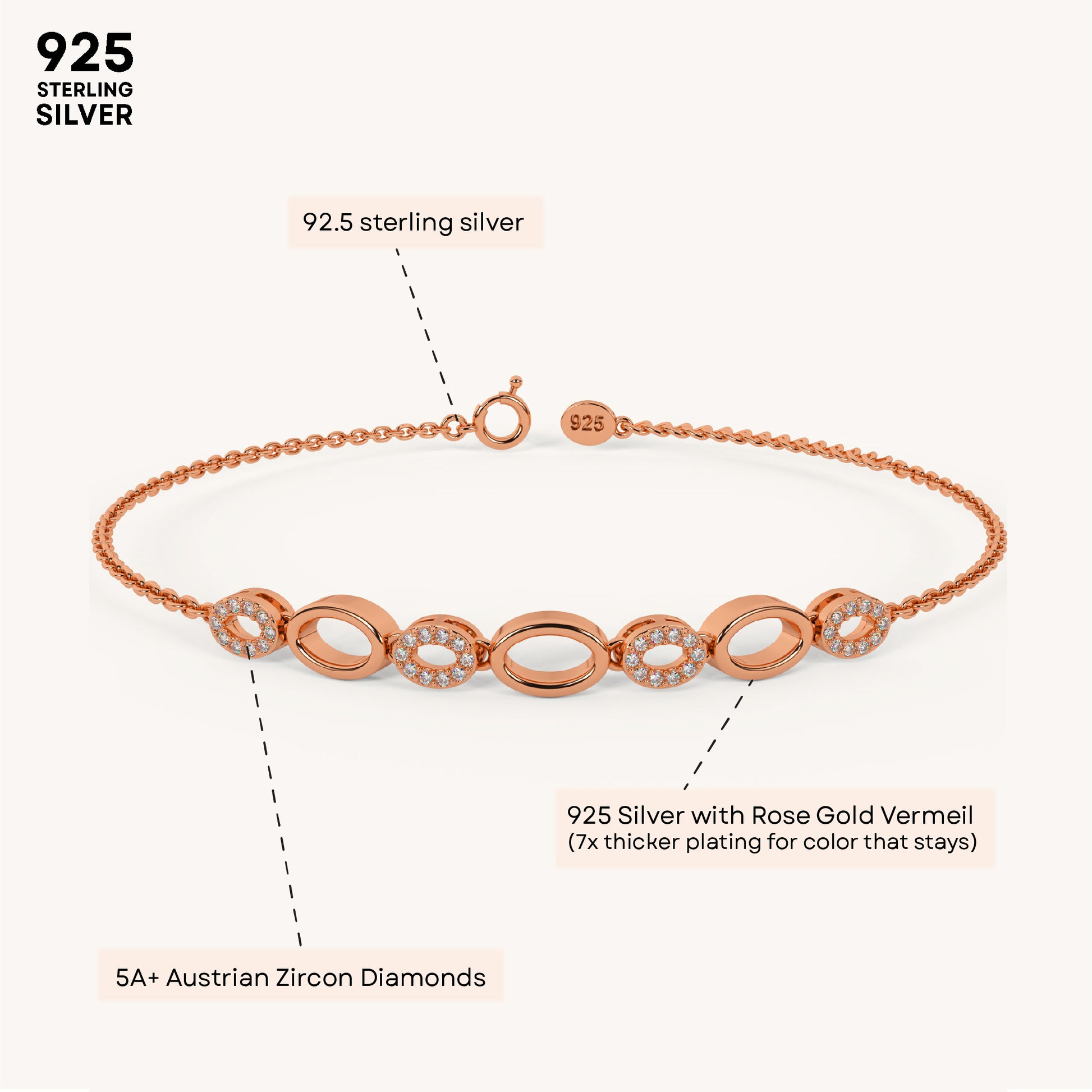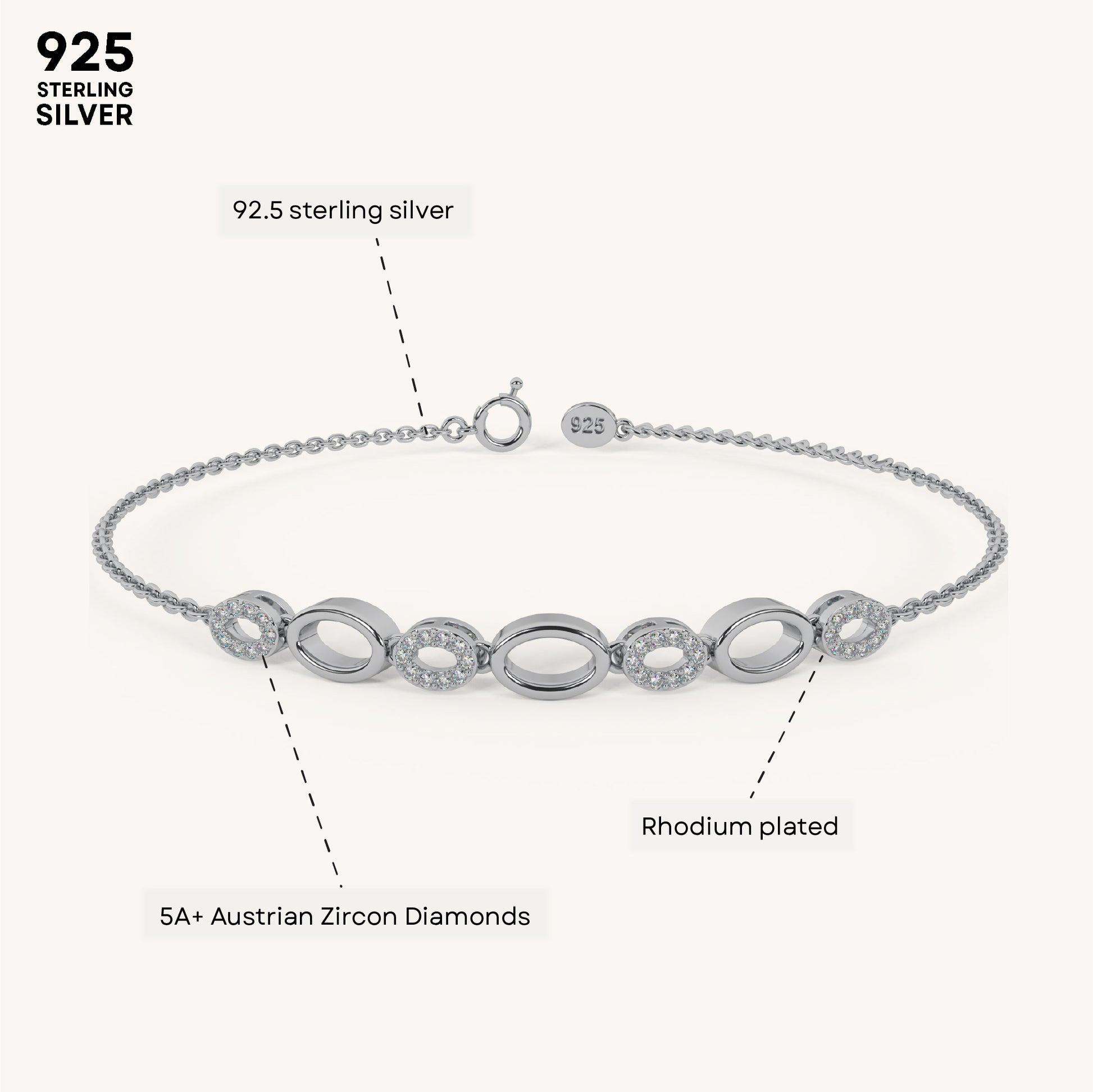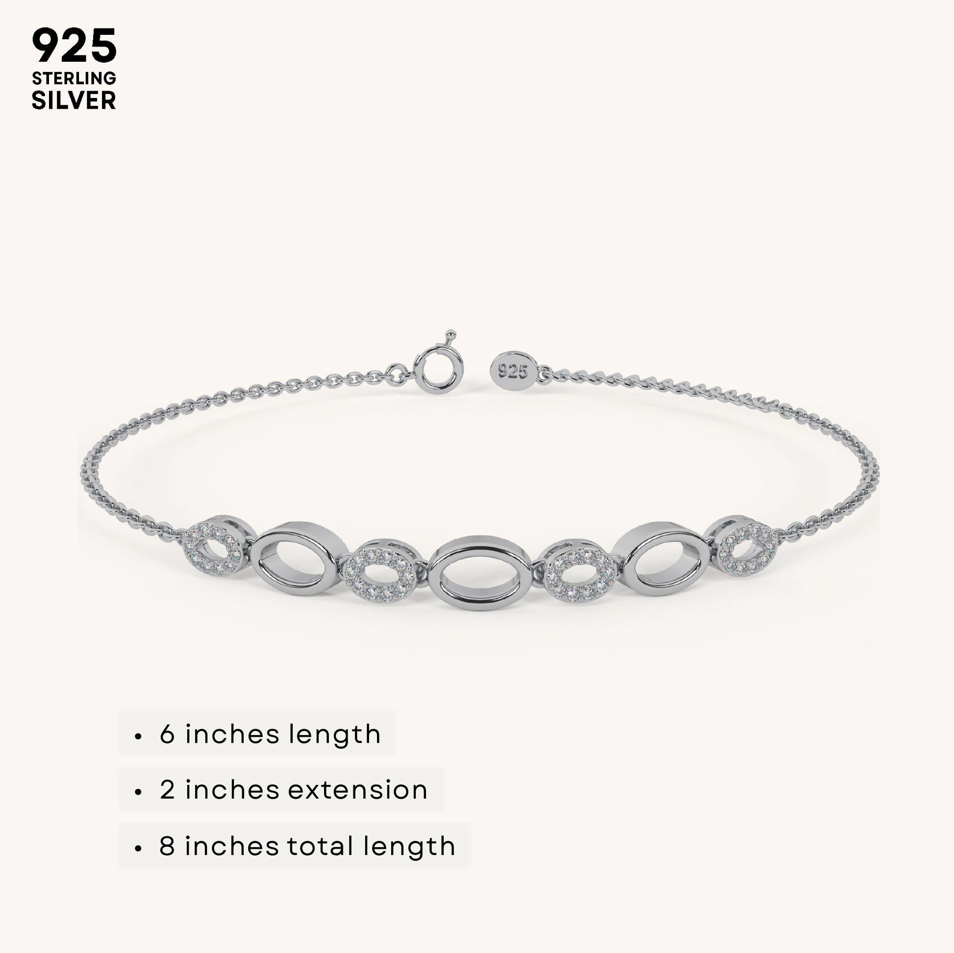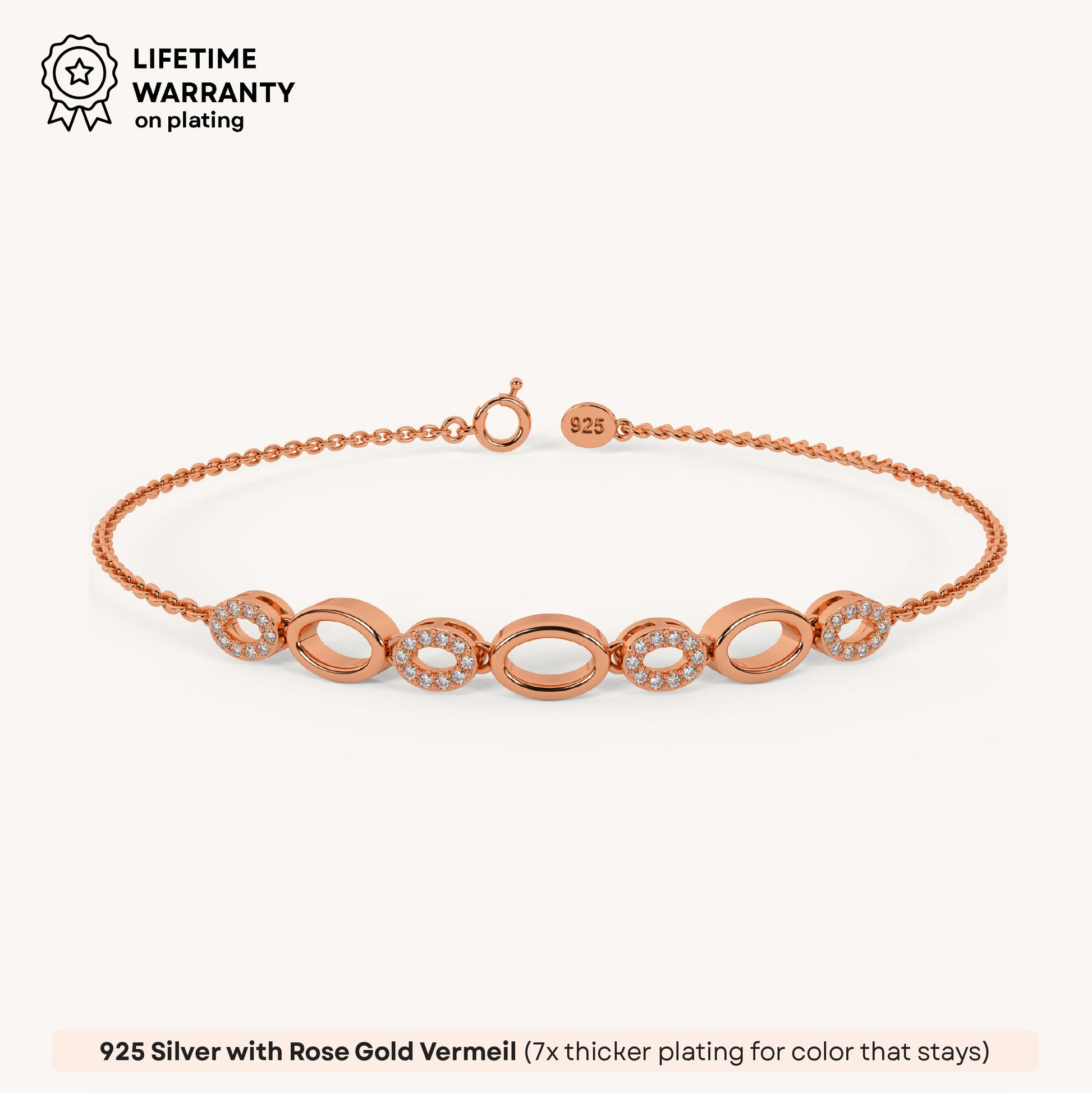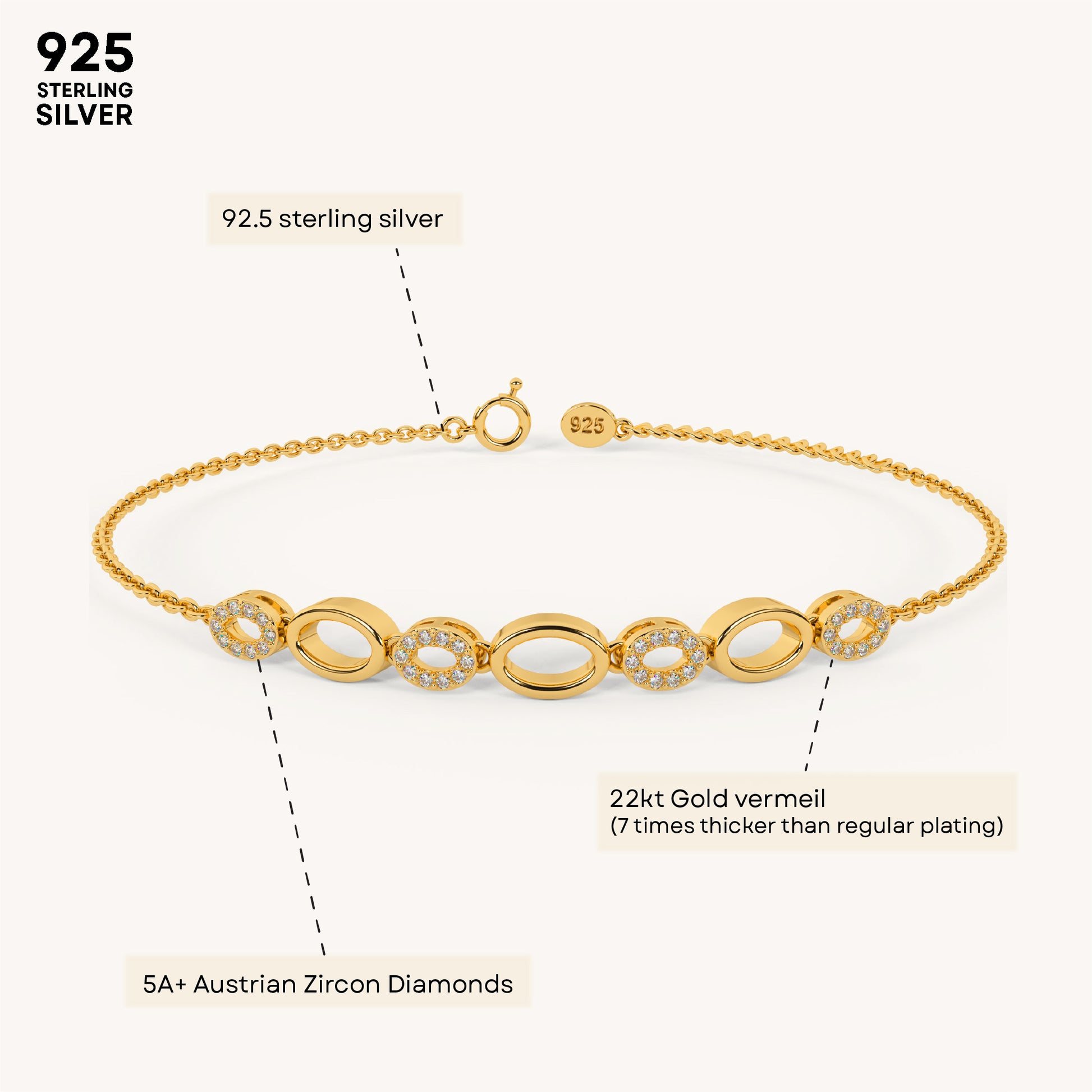 The Oval Cluster Bracelet showcases a bold arrangement of oval-shaped links, elegantly connecting stunning diamonds. Crafted in premium 92.5 Sterling Silver, plated with 22k gold Vermeil with 7x thicker coating and adorned with the finest 5A+ Austrian Zircon diamonds for a brilliant, timeless shine.