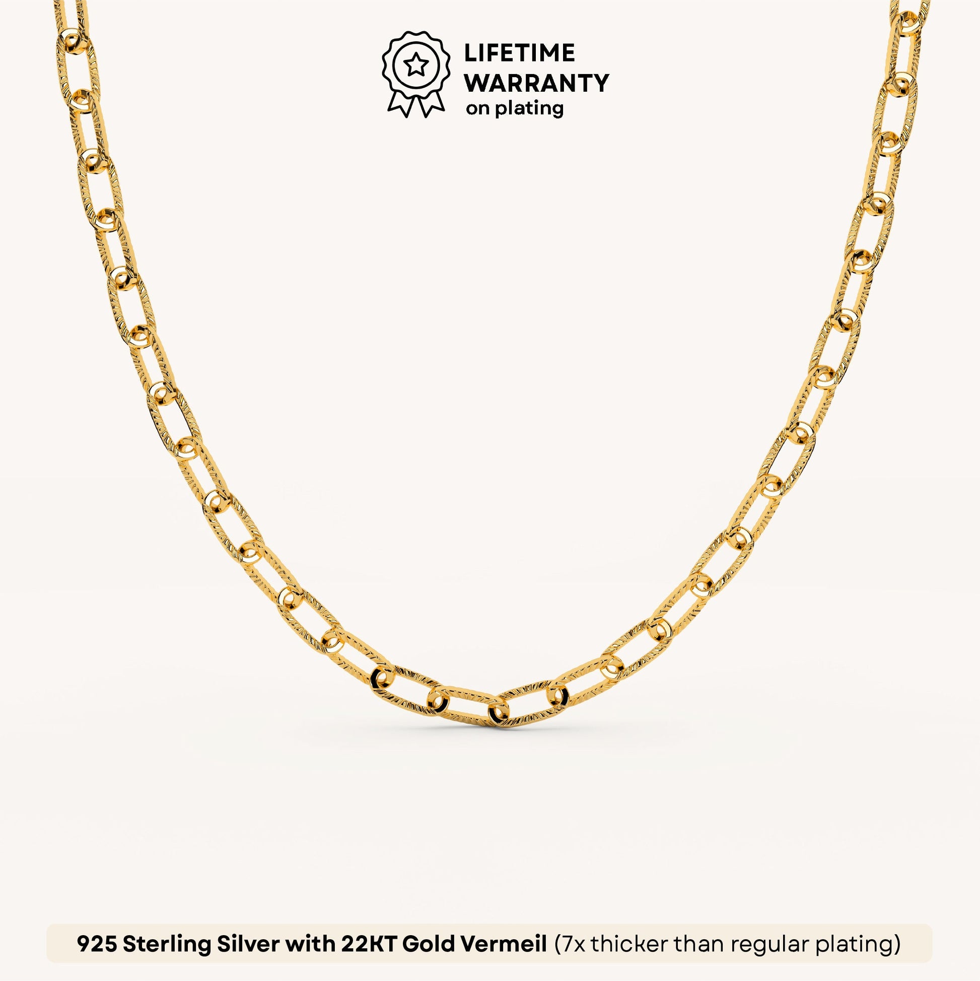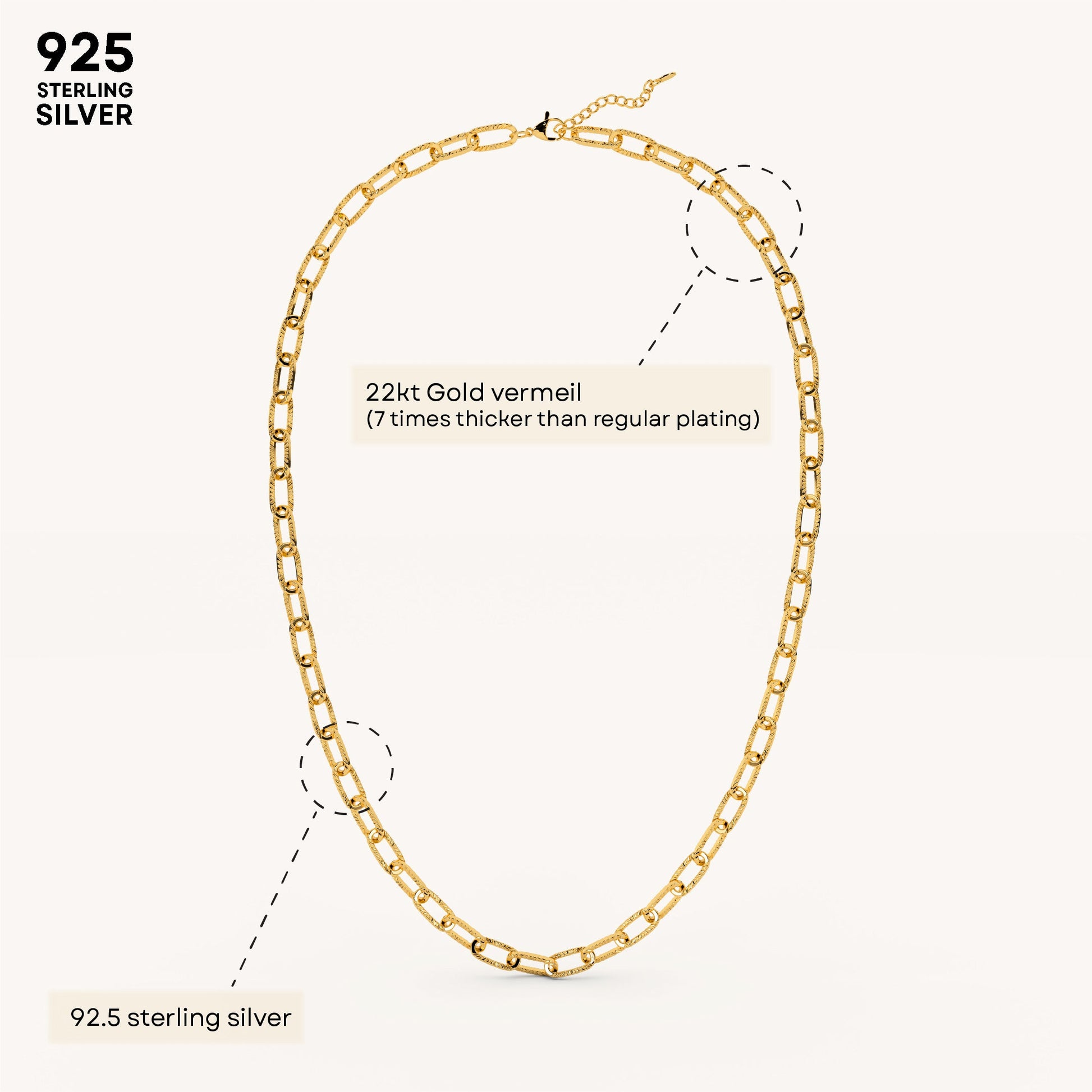 Edgy but make it classy. The paperclip chain slays with minimal effort. Crafted in 92.5 Sterling Silver, dipped in luxe 22k gold vermeil with 7x thicker coating. Lowkey bold, high key essential.