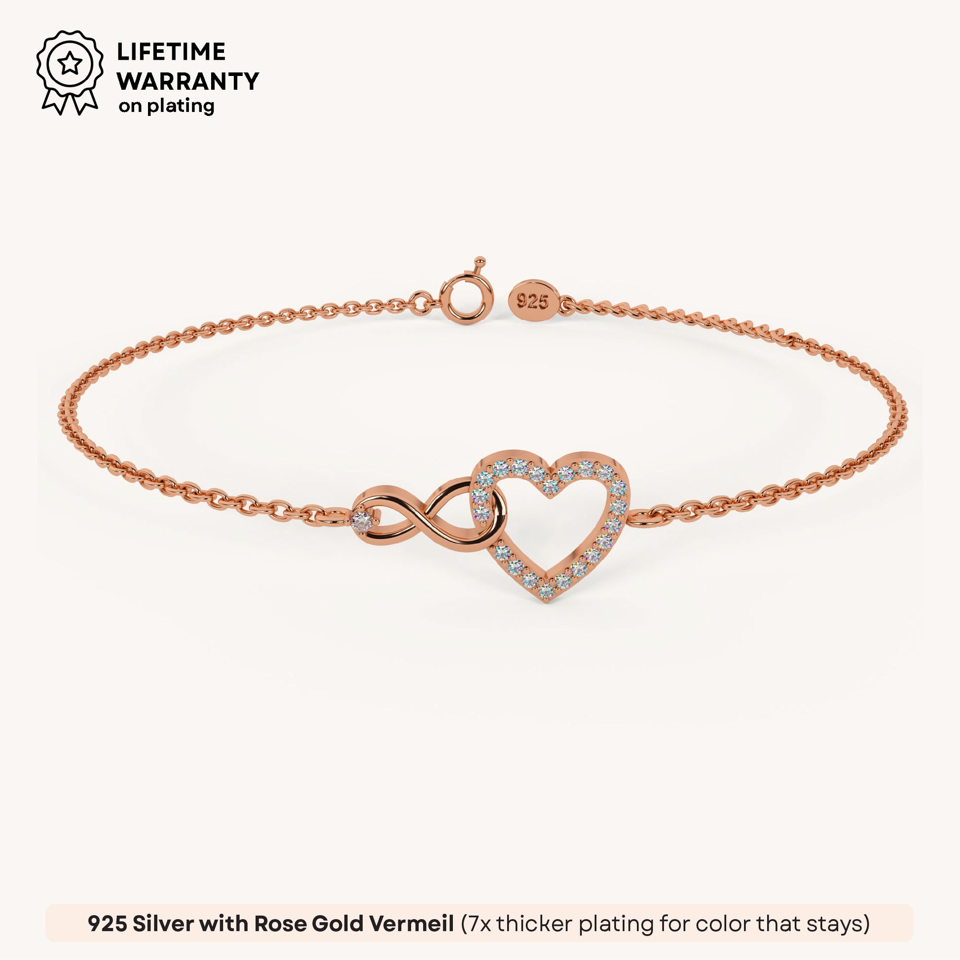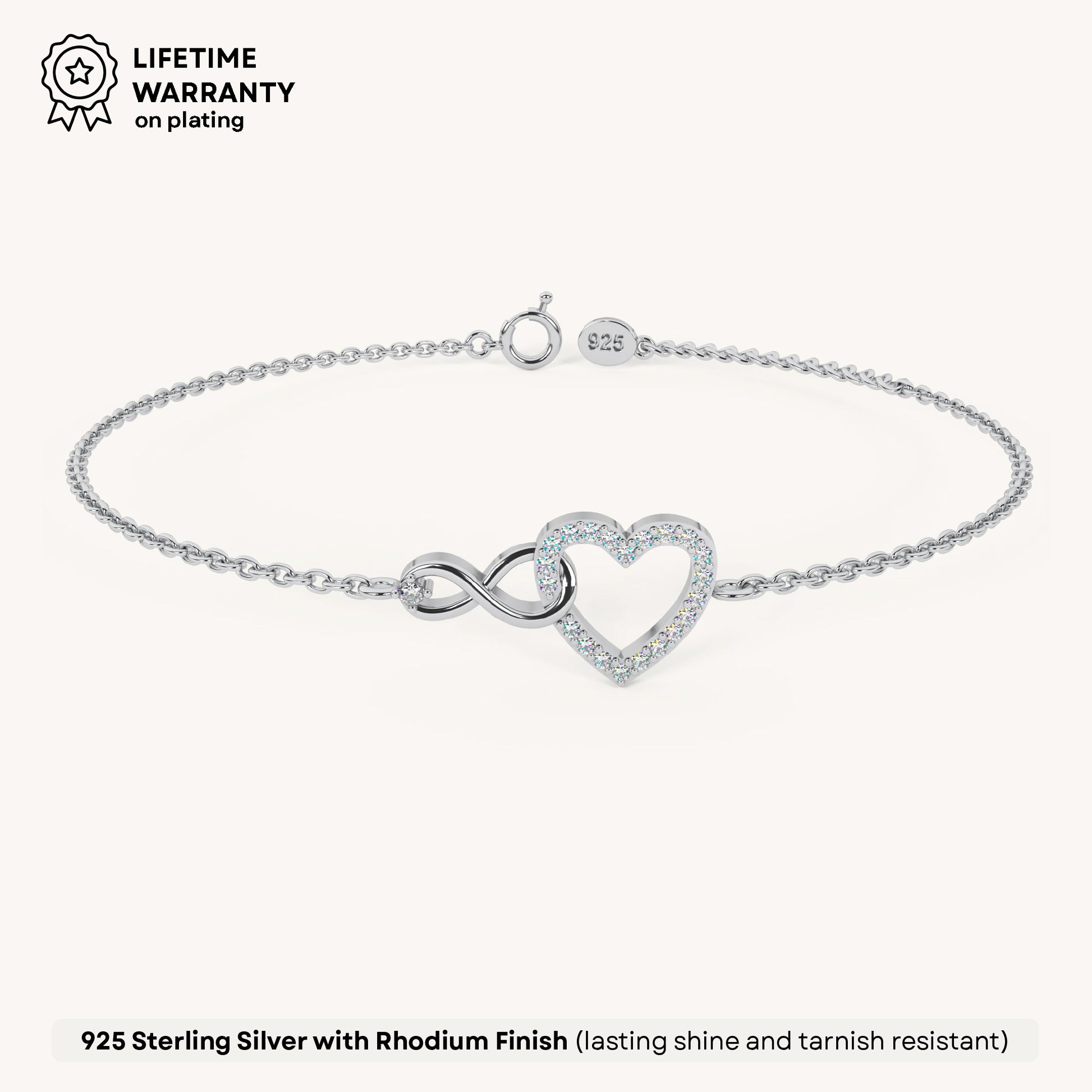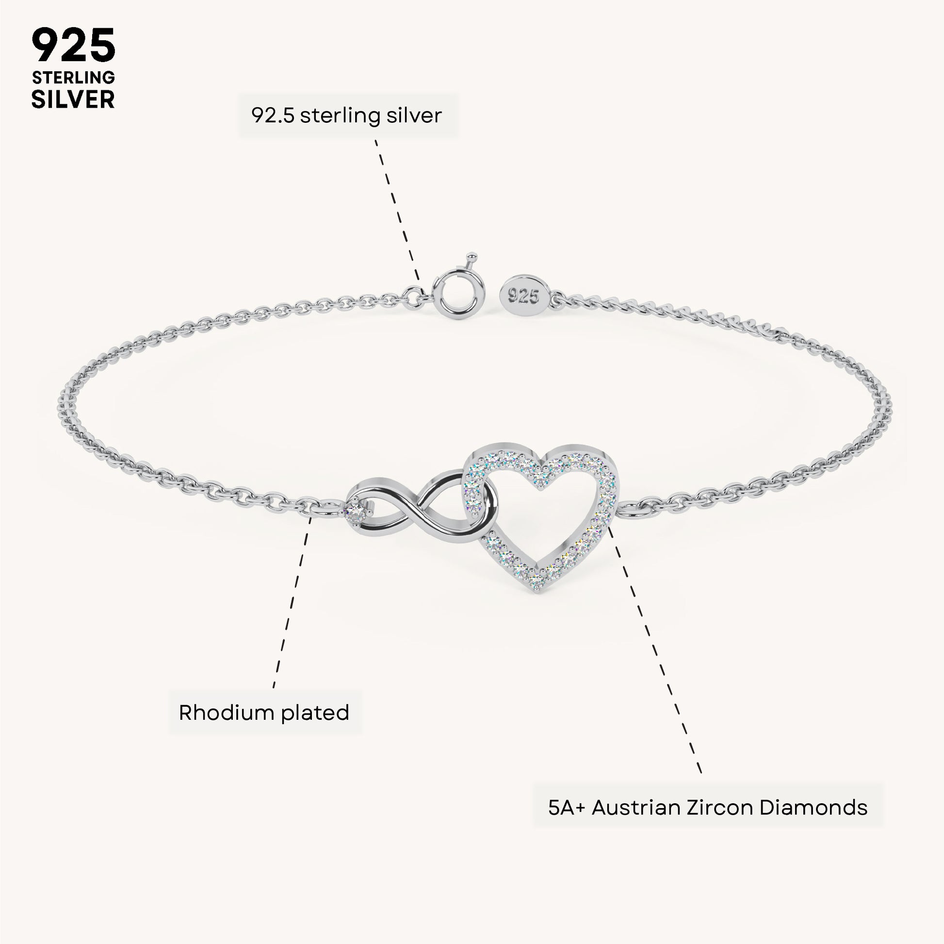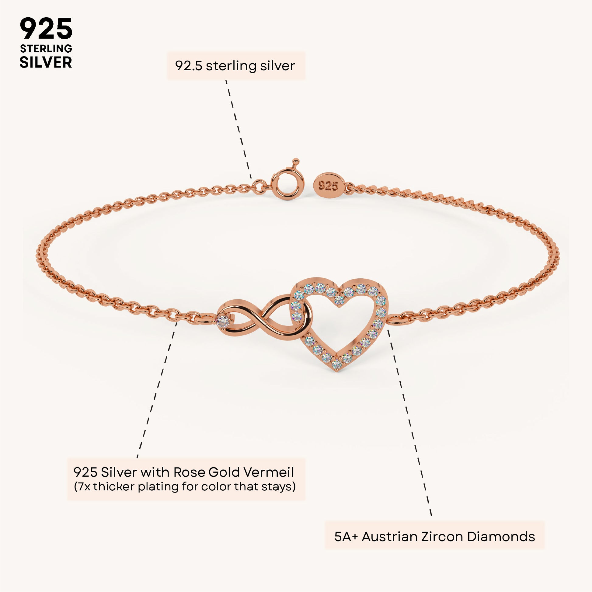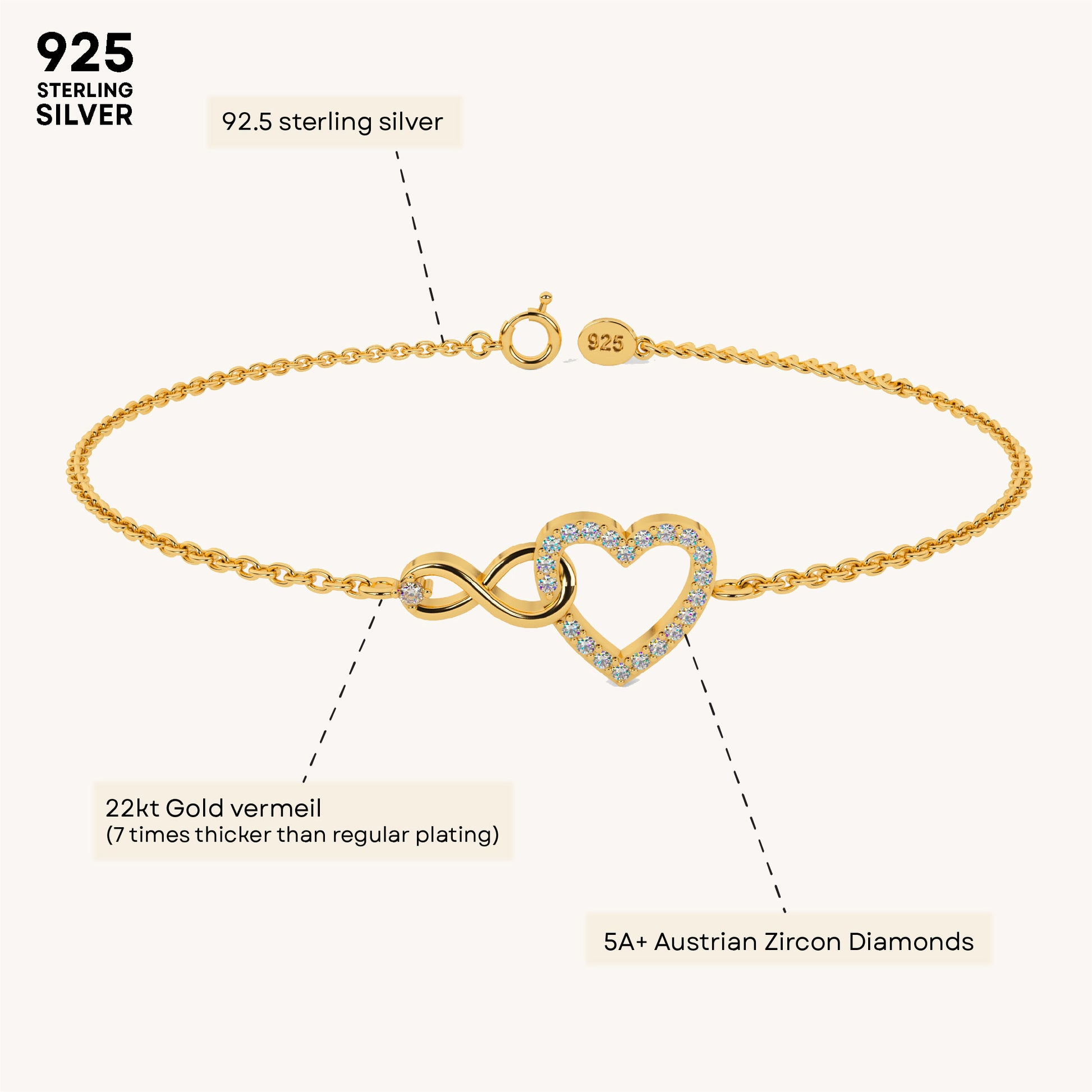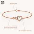 The Pure Heart Infinity Bracelet entwines heart and infinity charms, symbolizing boundless love and connection between two lovebirds. Crafted in 92.5 sterling silver, plated with 22k gold vermeil with 7x thicker coating and studded with brilliant 5A+ Austrian Zircon Diamonds, this bracelet is a timeless addition to any collection.