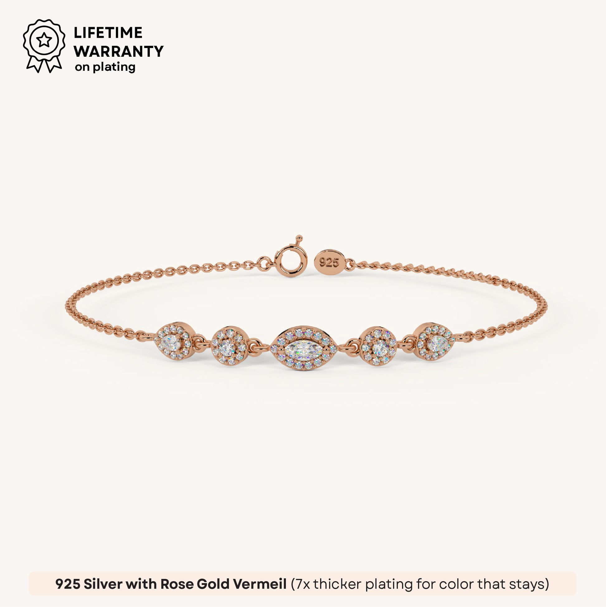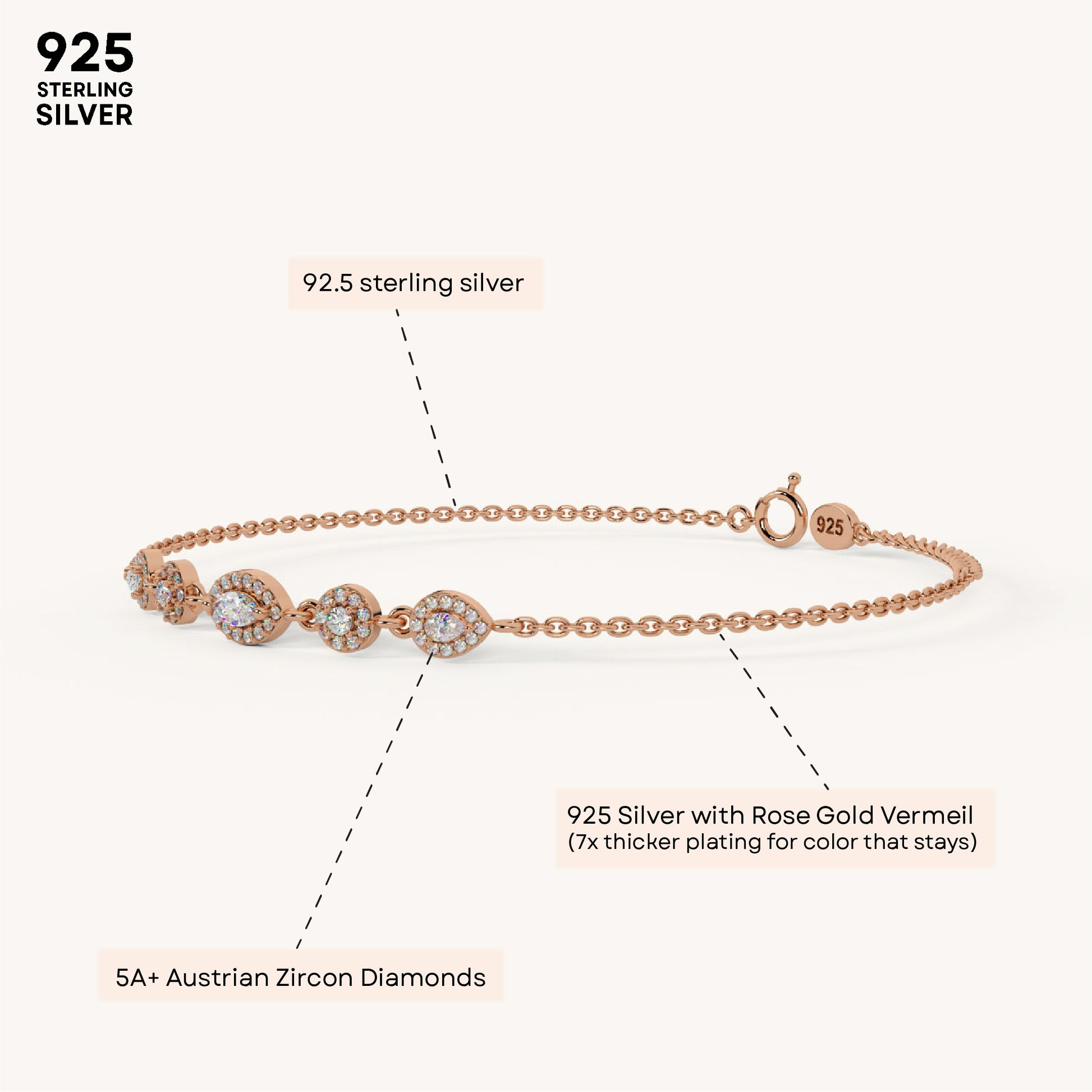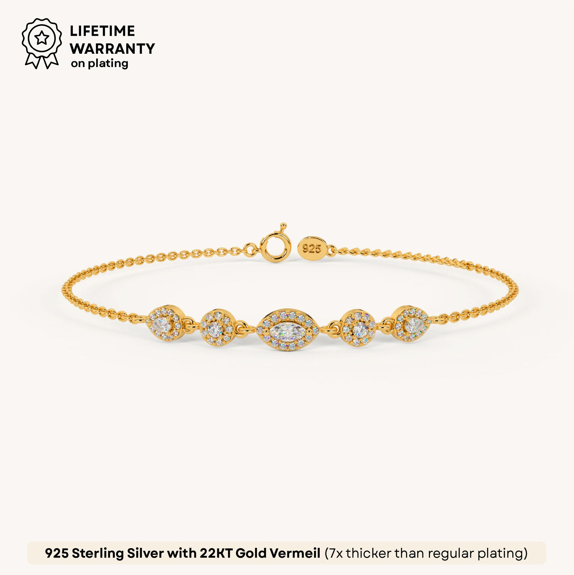 Introducing the "Royal Trinity Diamond Bracelet" – a masterpiece of harmony and opulence, meticulously crafted in lustrous 92.5 Sterling Silver with lavish 22K Gold Vermeil accents, adorned with dazzling 5A+ Austrian Zircon diamonds in a captivating trio of pear, round, and marquise cuts. Each curve and facet reflect unparalleled artistry, blending timeless elegance with modern brilliance, making it more than just jewelry