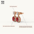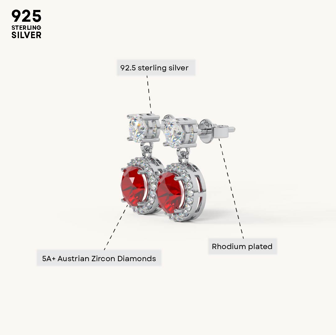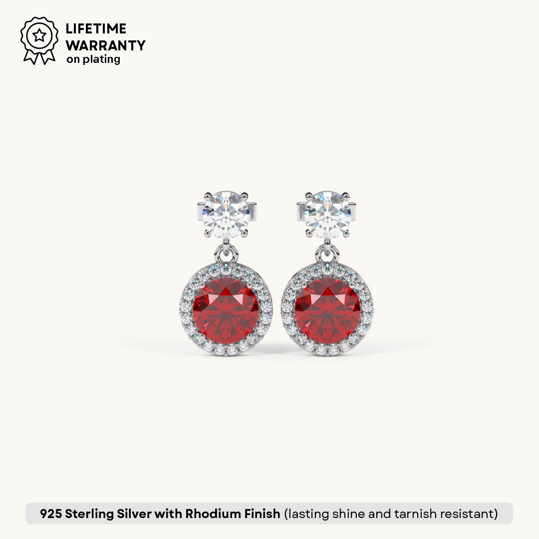 Elevate your look with the captivating Ruby Halo Dangle Stud earrings. Crafted from genuine 92.5 Sterling Silver, these earrings feature a brilliant clear round stud above a dramatic, round ruby-red stone encircled by a dazzling halo. A luxurious 22kt Gold Vermeil coating provides a rich and lasting finish with a 7x thicker coating than regular plating. The clear stones are premium 5A+ Austrian Zircon diamond, offering exceptional sparkle and timeless glamour.