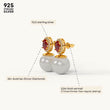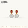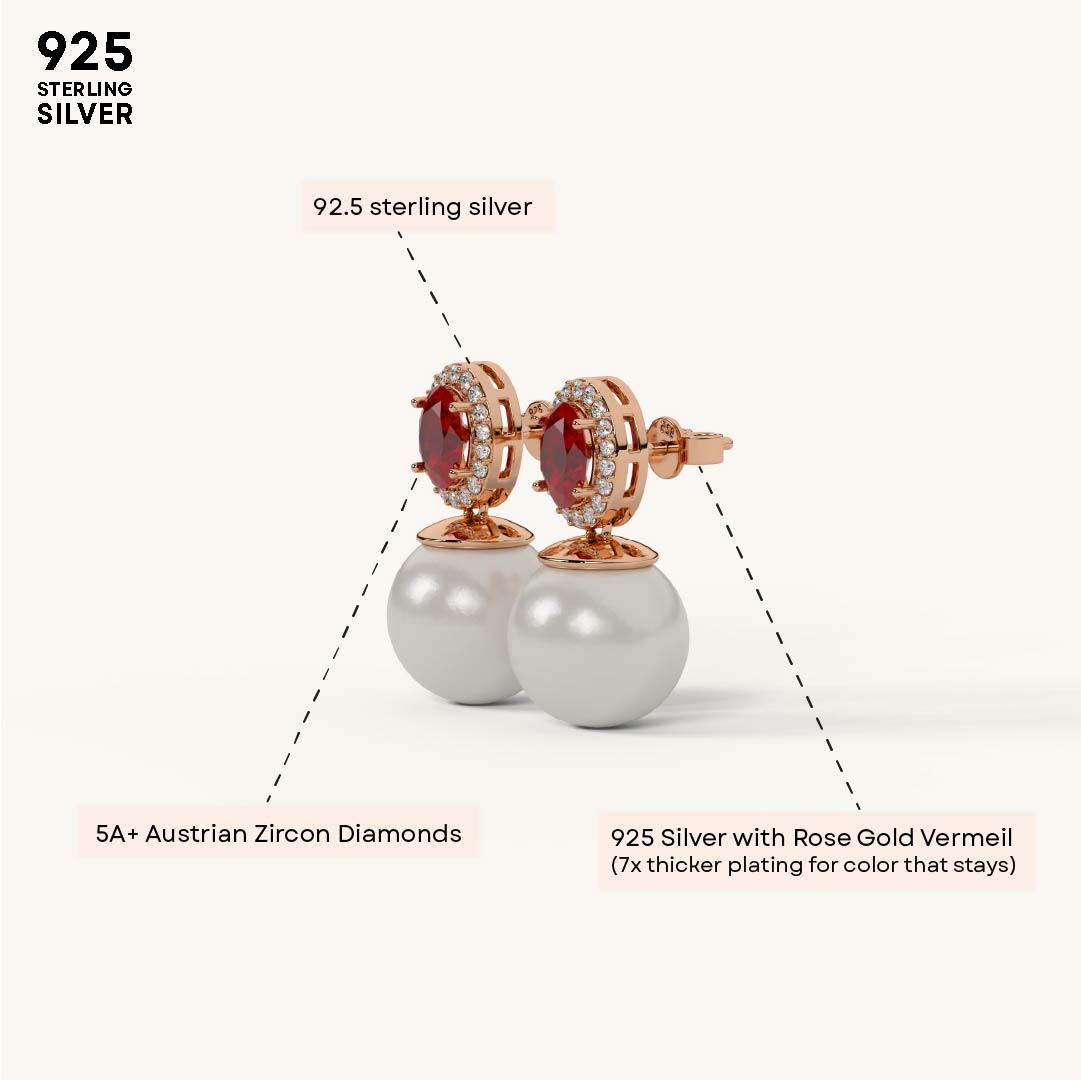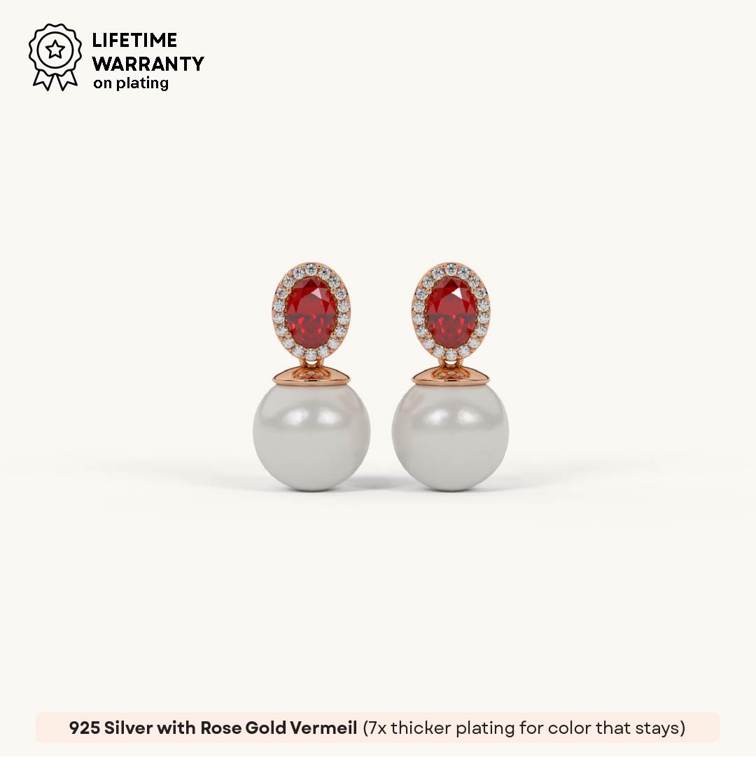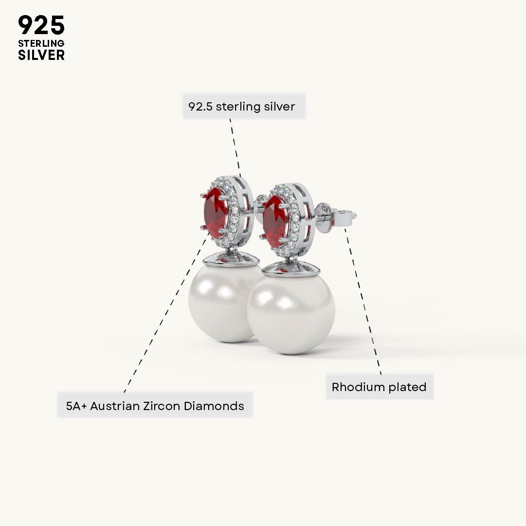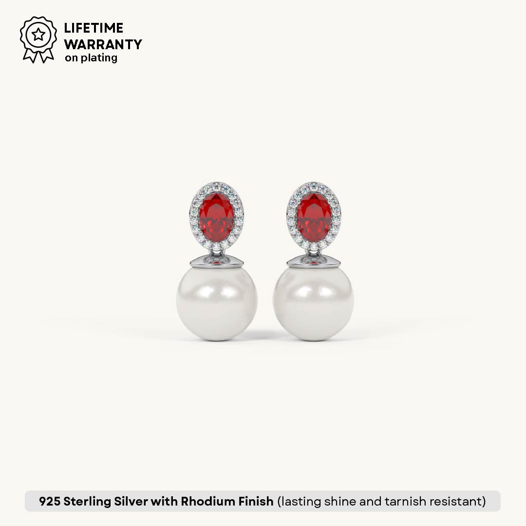 Adorn yourself with the elegant Ruby Halo Pearl Drop earrings. Crafted from genuine 92.5 Sterling Silver, these sophisticated studs feature a vibrant oval ruby-red stone encircled by a dazzling halo, from which a lustrous white pearl drops. A luxurious 22kt Gold Vermeil coating provides a lasting finish with a 7x thicker coating than regular plating. The accent stones are brilliant 5A+ Austrian Zircon diamonds, offering exceptional sparkle and classic charm.