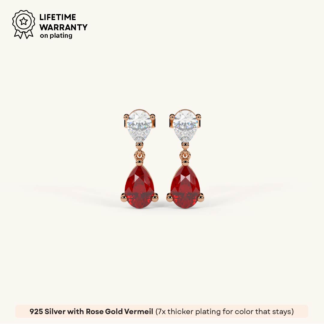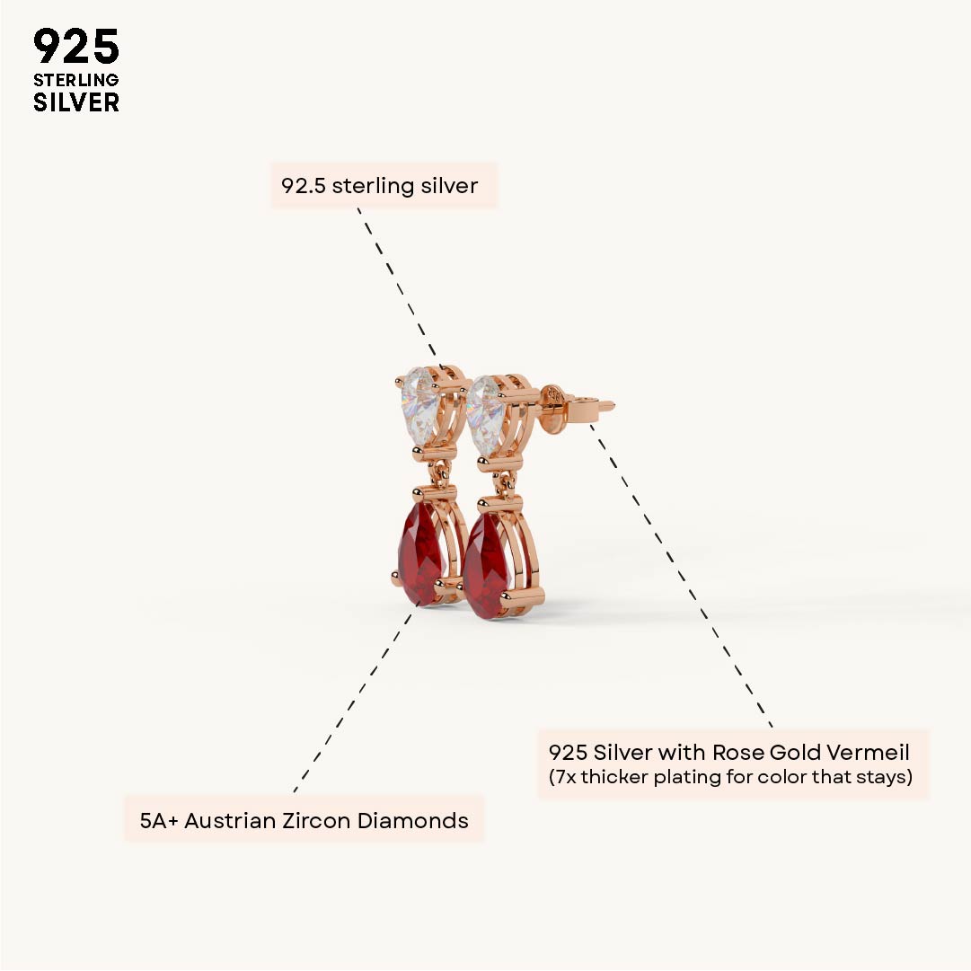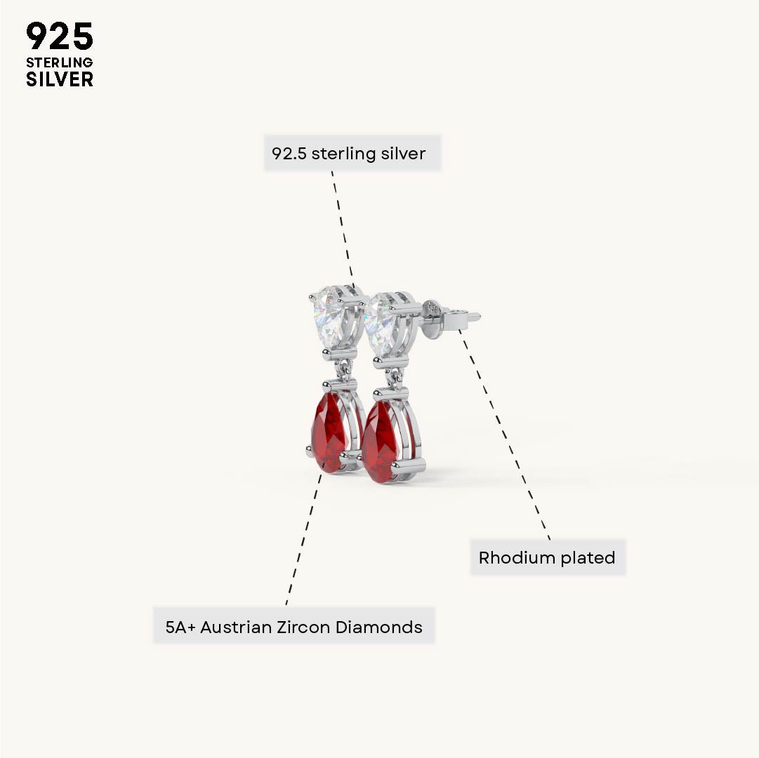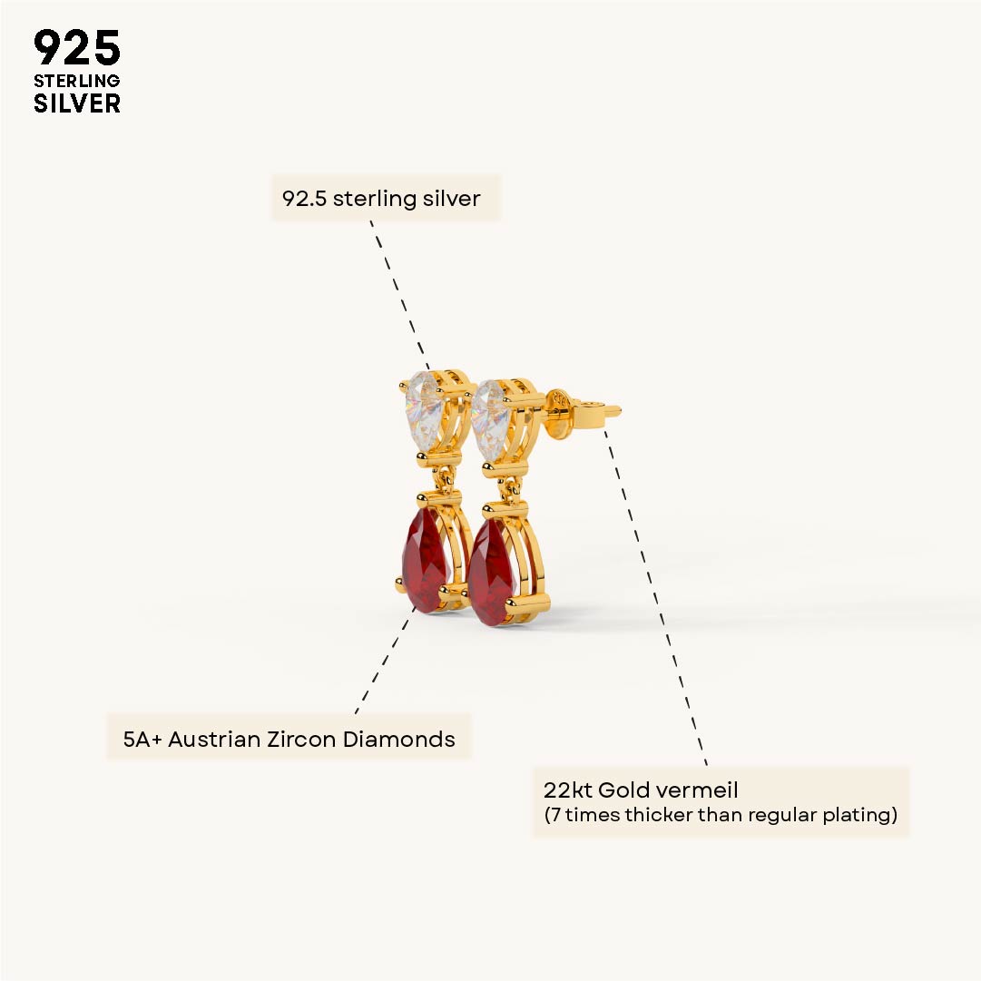 Elevate your style with these dazzling Ruby Pear Drop Dangler earrings. Crafted from genuine 92.5 Sterling Silver, they feature a beautiful clear and ruby-red pear-cut design. A luxurious 22kt Gold Vermeil coating provides a lasting finish with a 7x thicker coating than regular plating. The stones are brilliant 5A+ Austrian Zircon diamonds, offering exceptional sparkle and elegance.