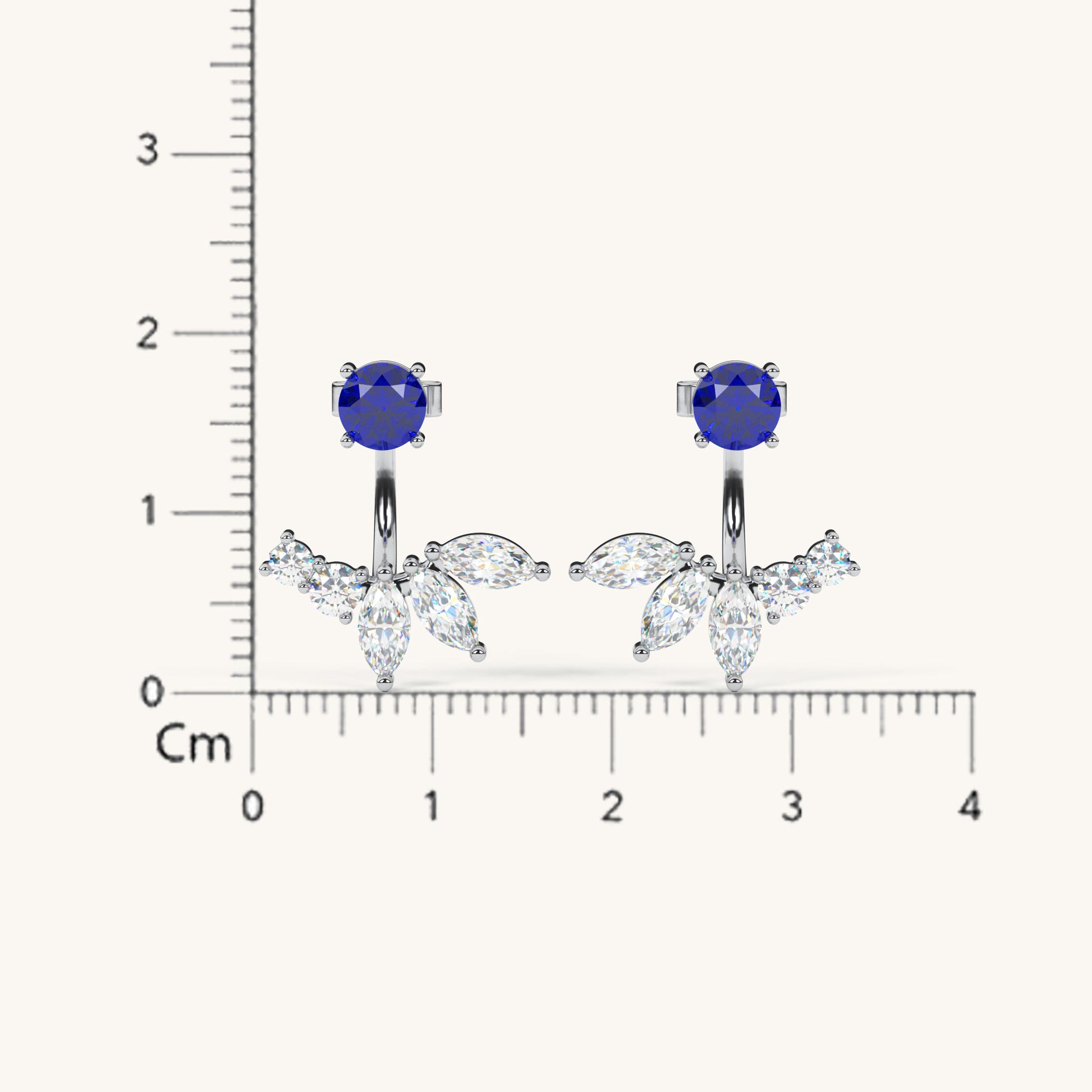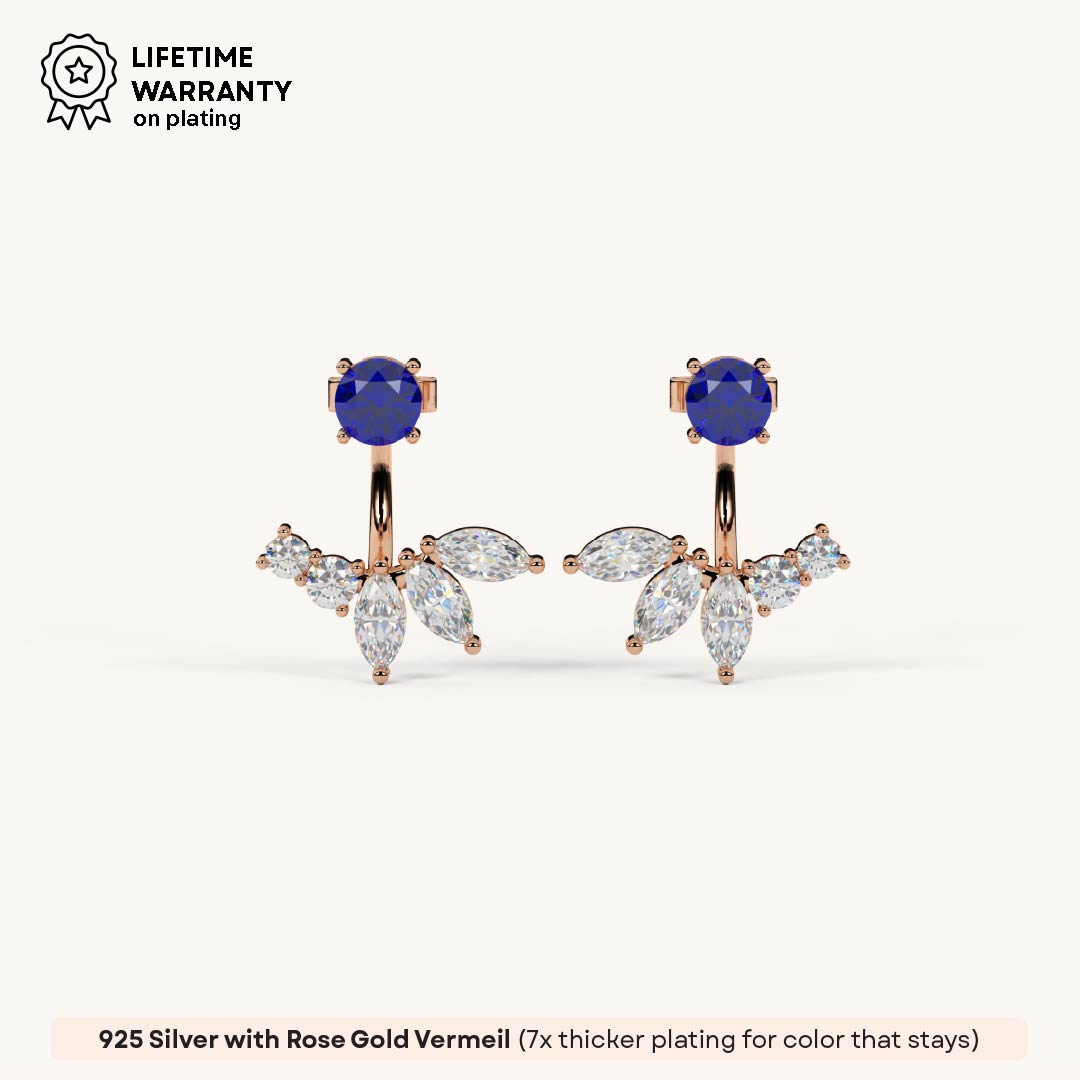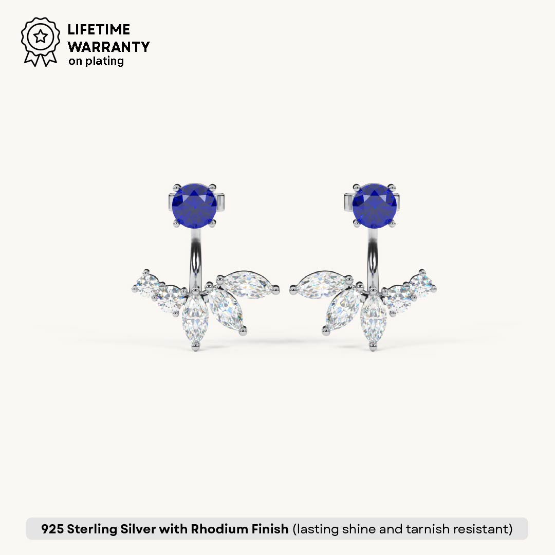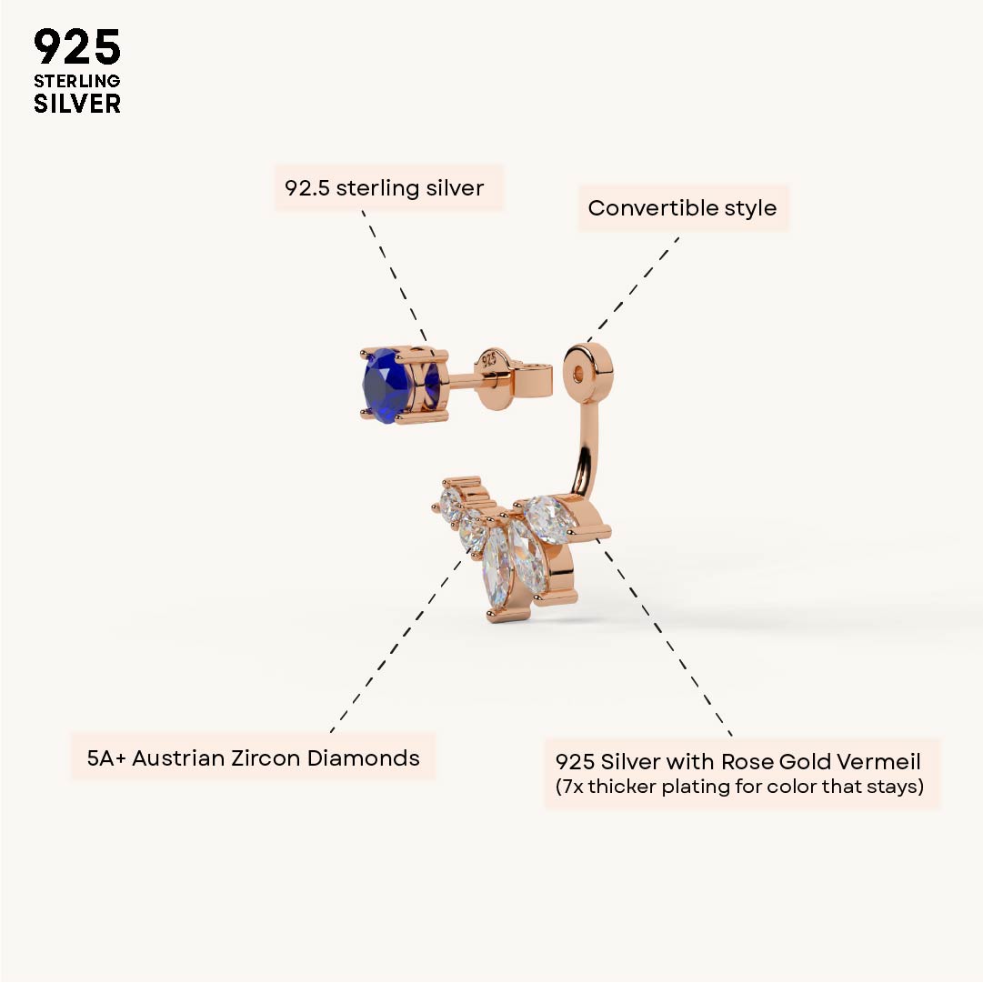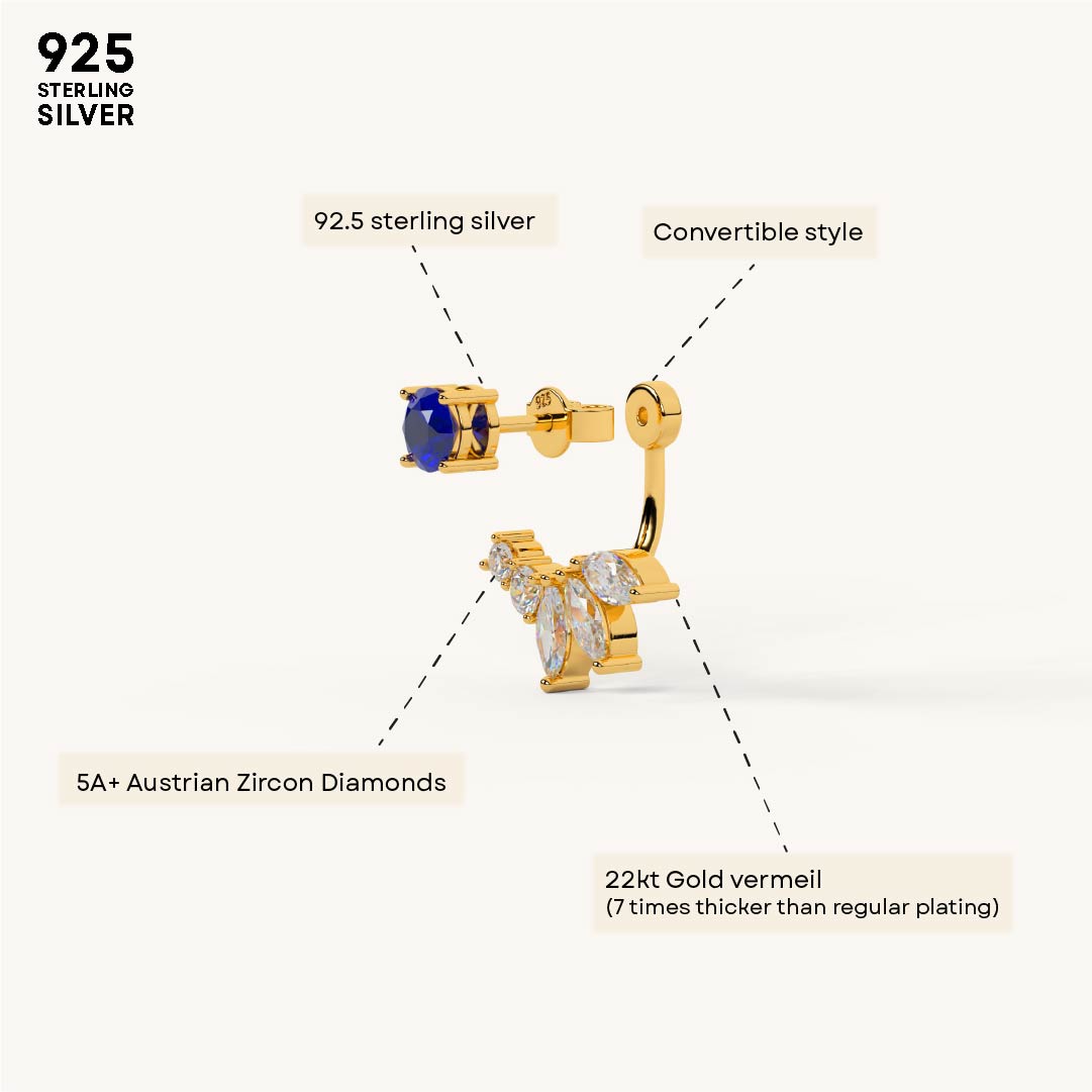 Experience two looks in one with the versatile Sapphire Convertible Jacket Stud earrings. Crafted from genuine 92.5 Sterling Silver, these earrings feature a rich sapphire-blue round stud that can be worn alone or with the detachable cluster earring jacket. The jacket is adorned with brilliant marquise-cut 5A+ Austrian Zircon diamonds, creating a dramatic, wing-like look. Finished with a luxurious 22kt Gold Vermeil coating (or Rose Gold Vermeil option), this piece boasts a 7x thicker coating than regular plating, ensuring superior shine and durability.