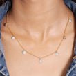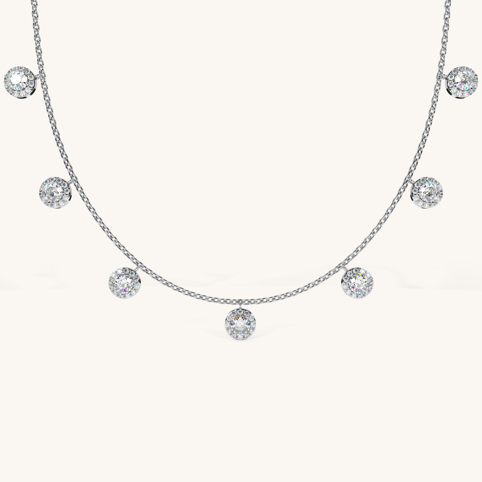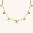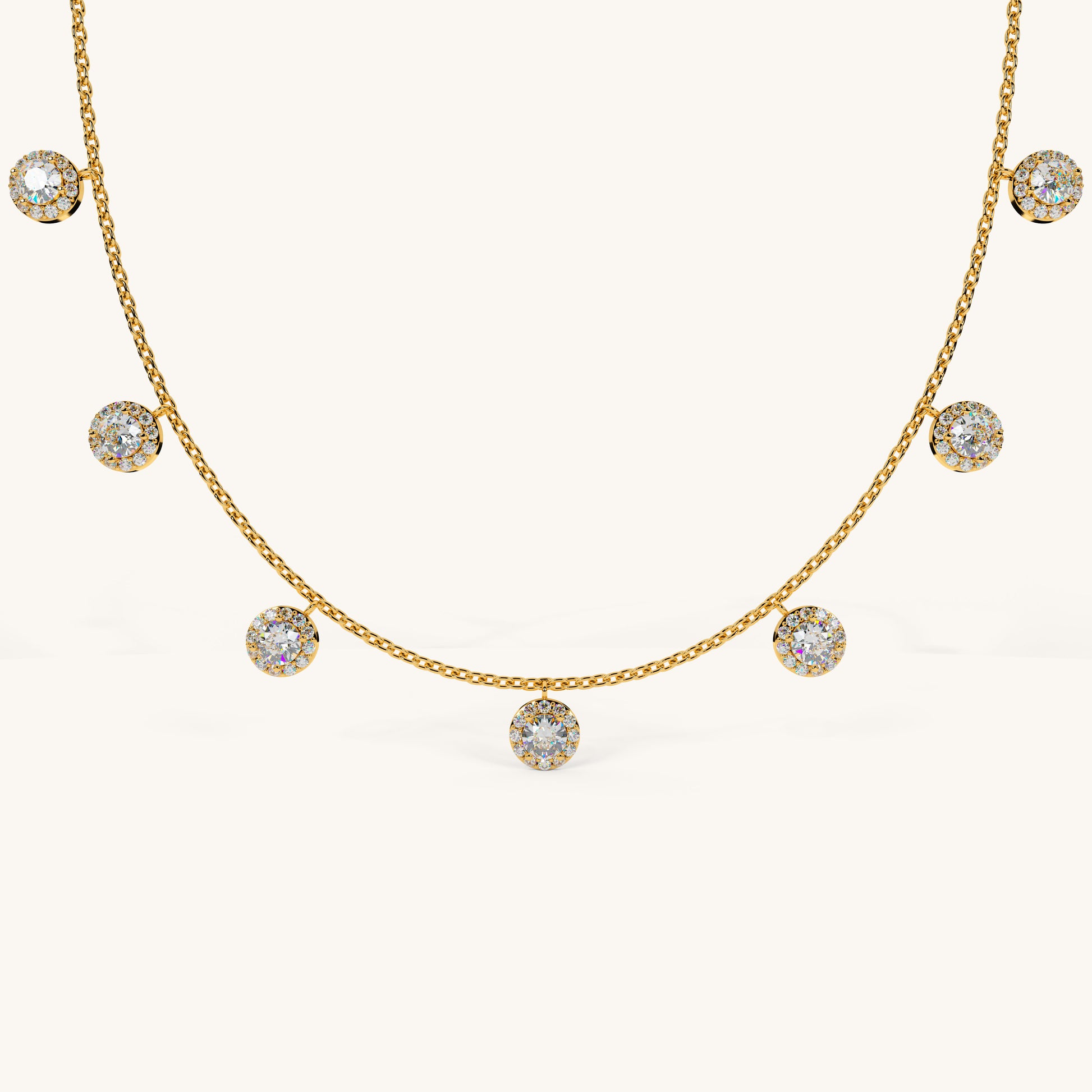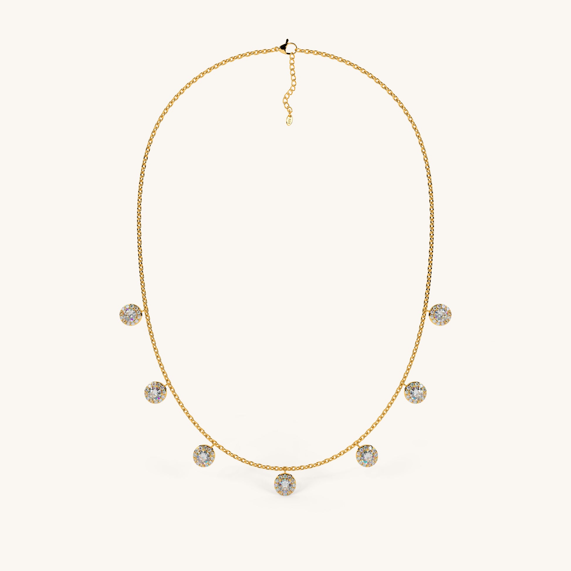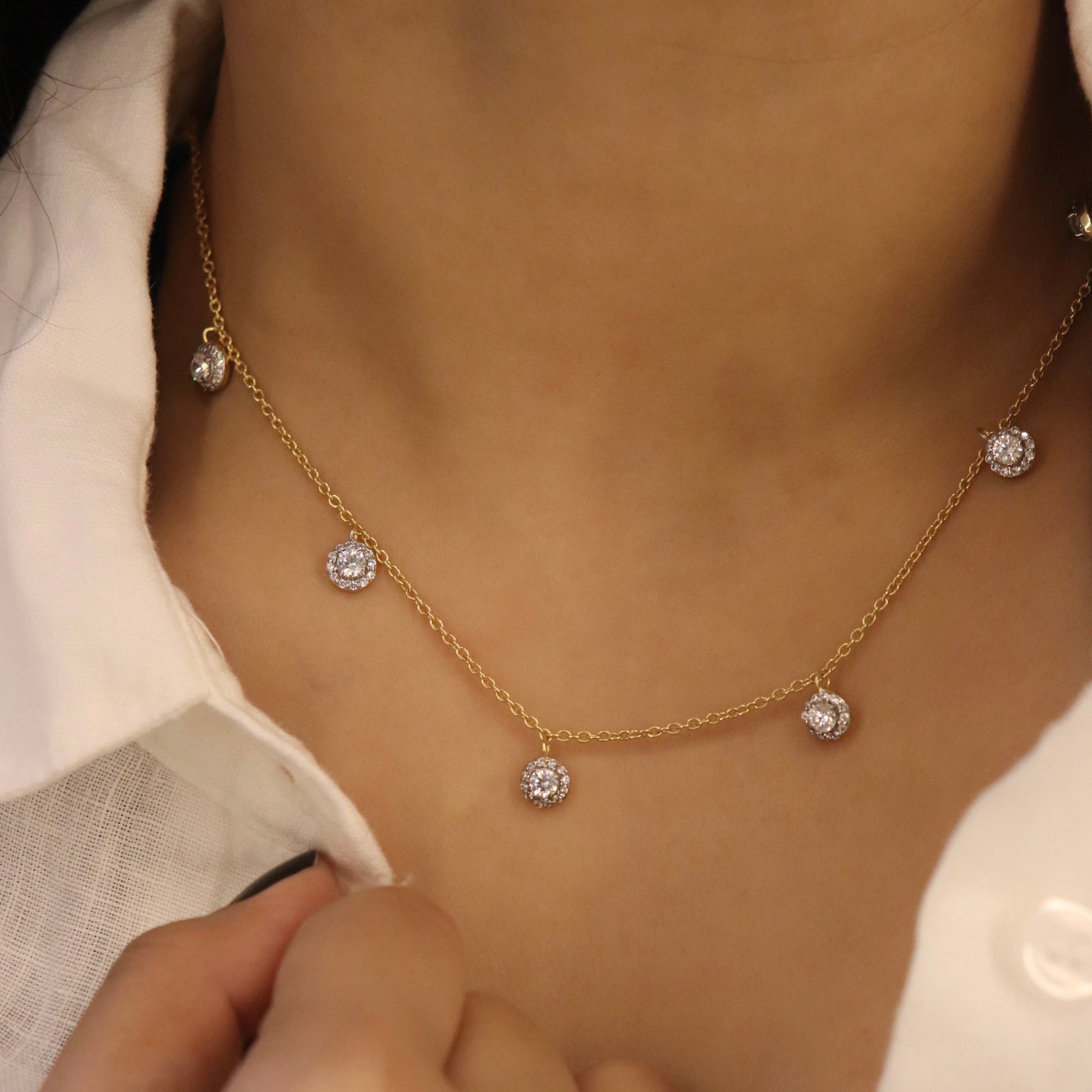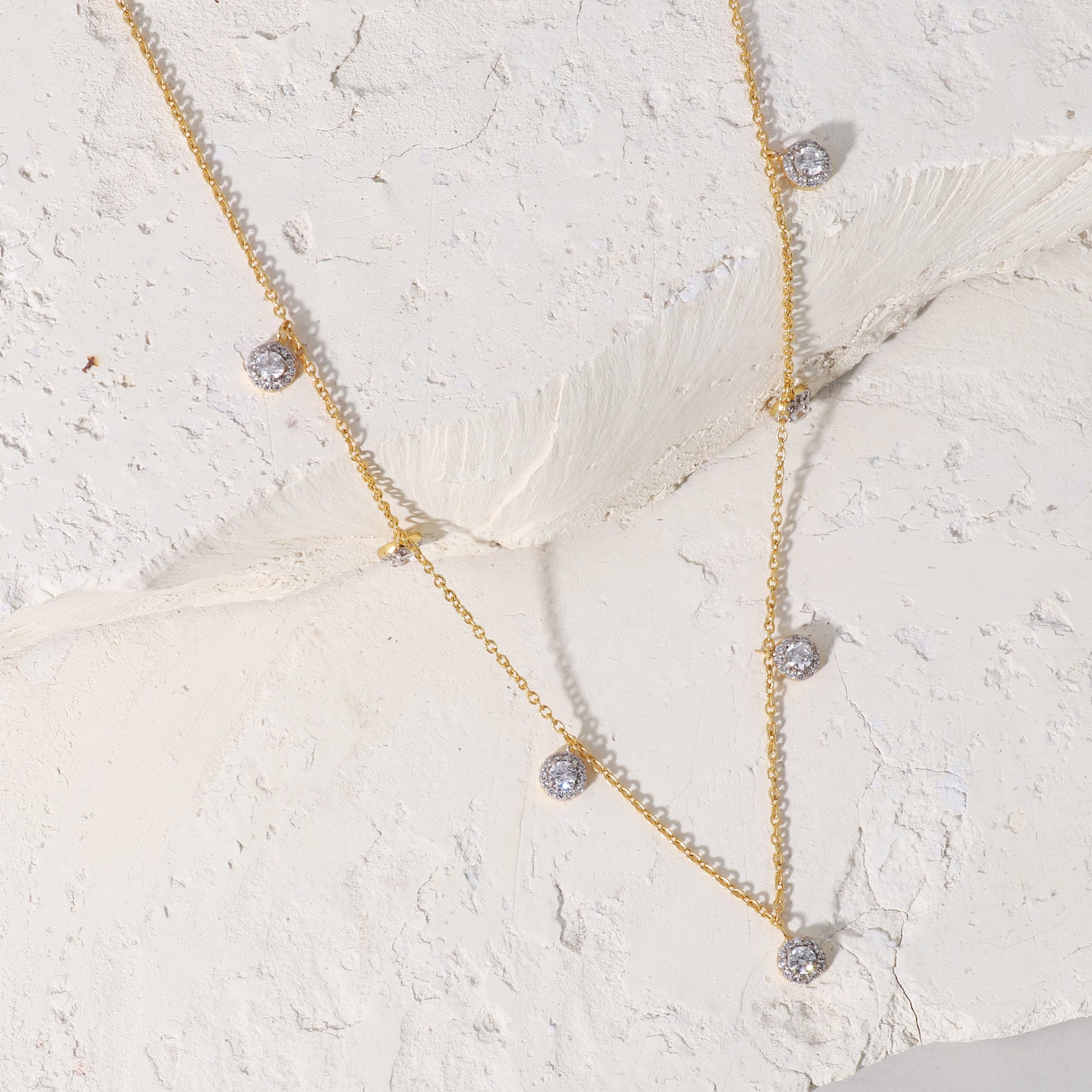 Sia Pave Necklace showcases five dazzling halo-set zircon diamonds, symbolizing grace and brilliance. Designed in 92.5 Sterling Silver with a luxurious 18k gold Vermeil finish, each 5A+ Austrian Zircon sparkles with unmatched radiance, making this piece a perfect blend of elegance and modern charm.