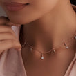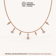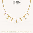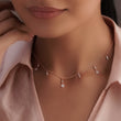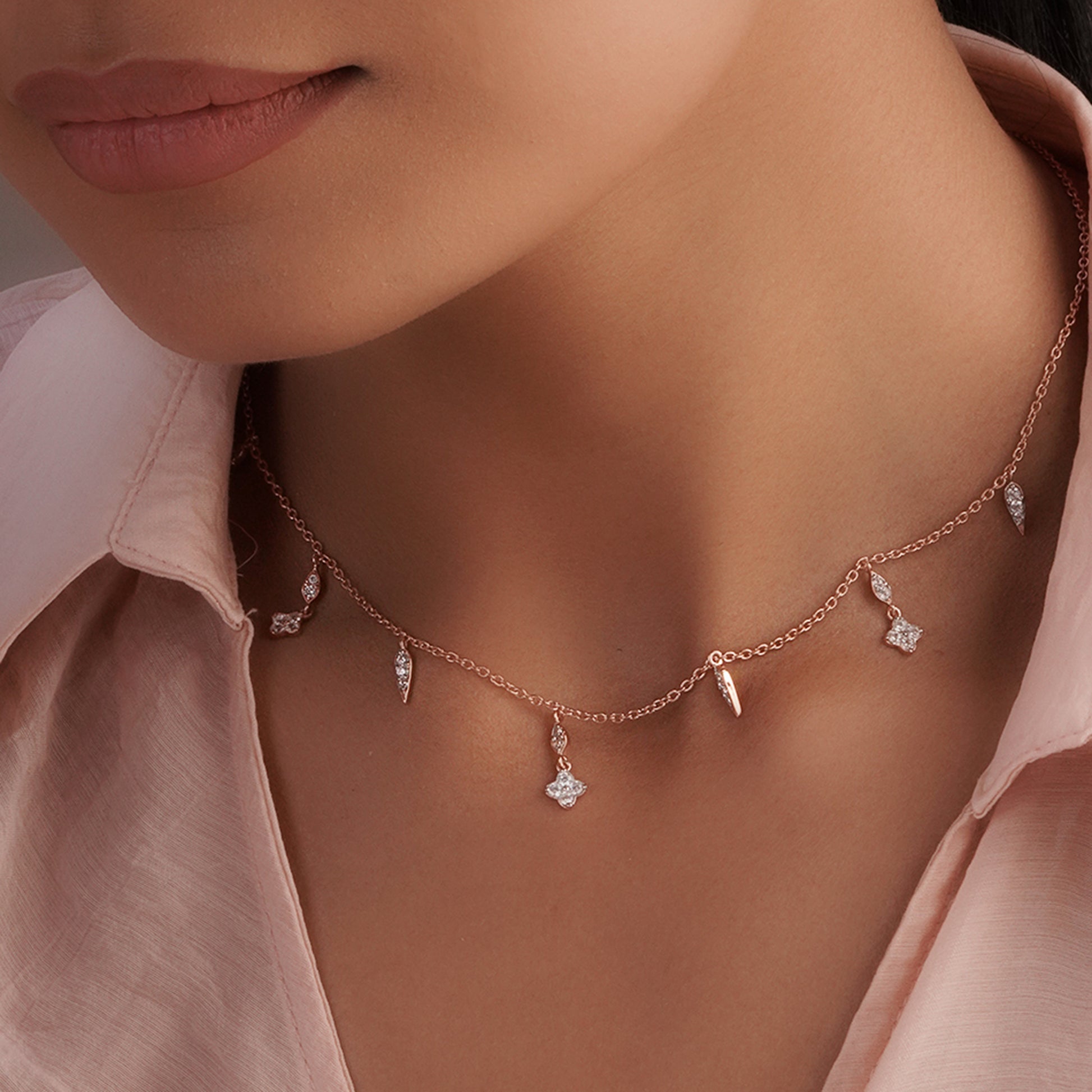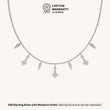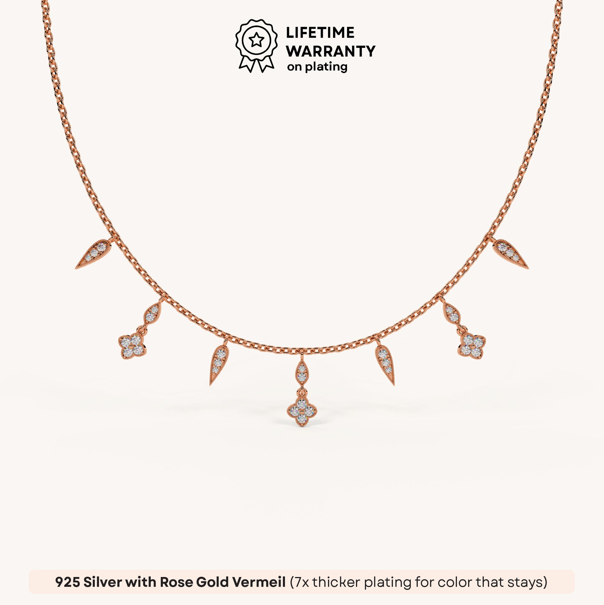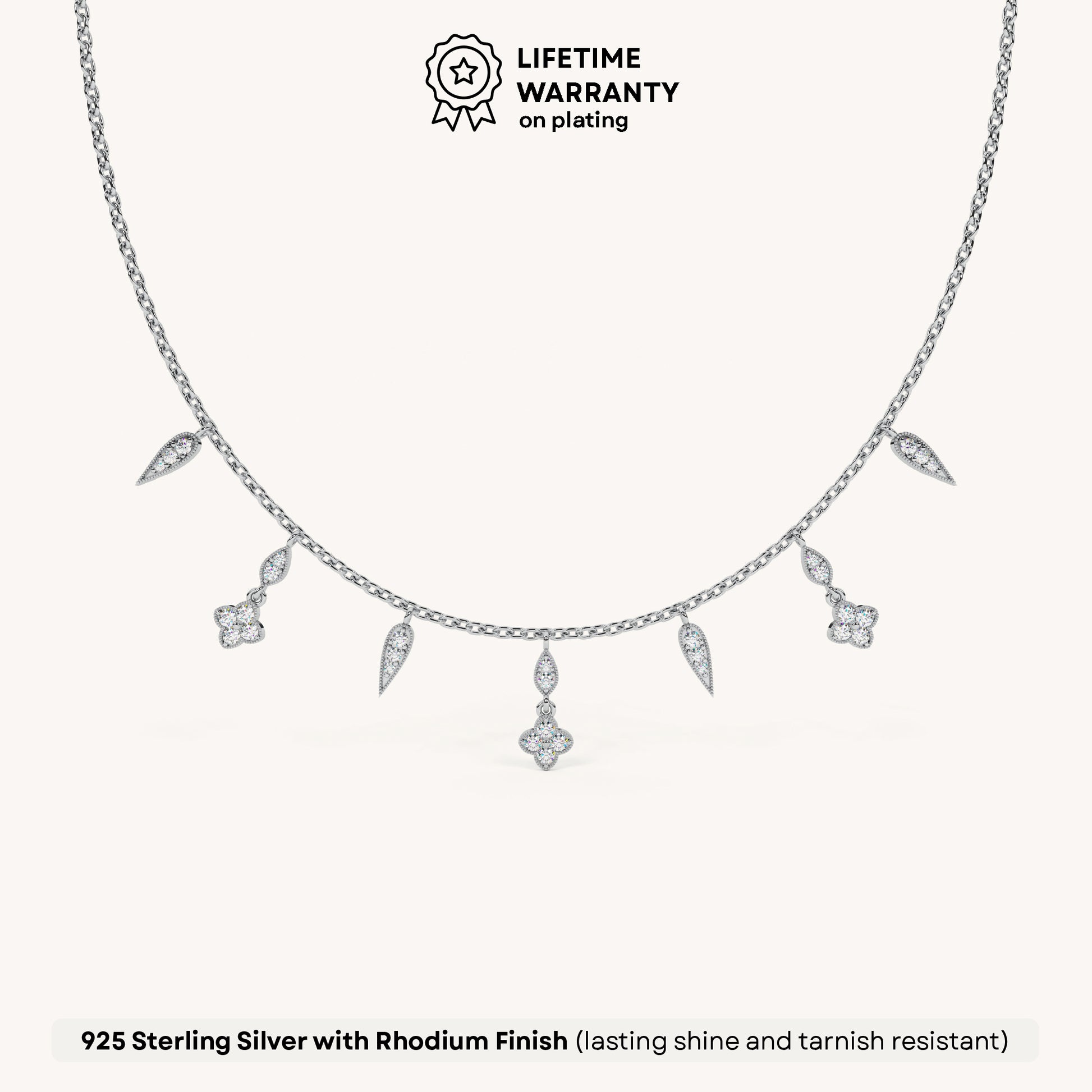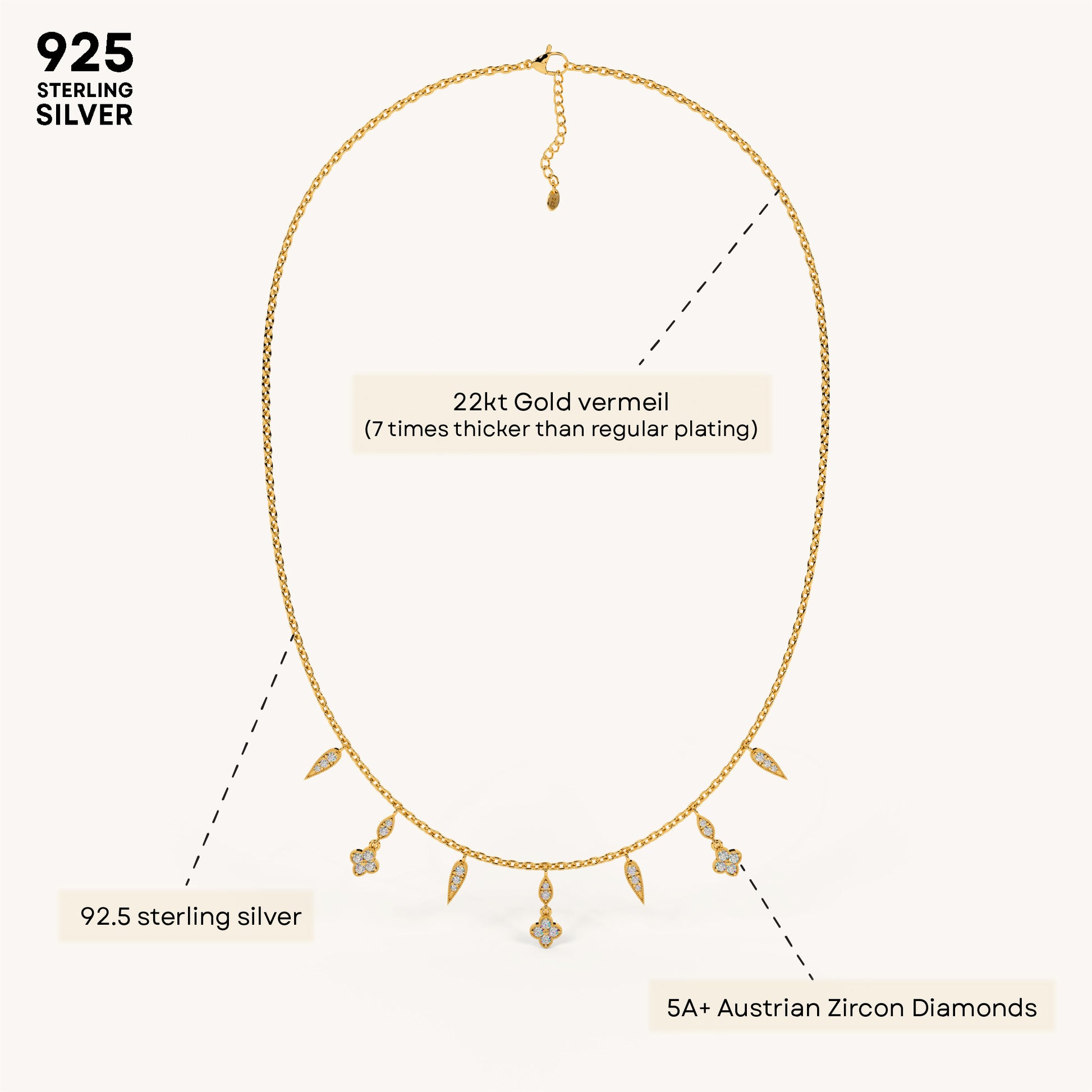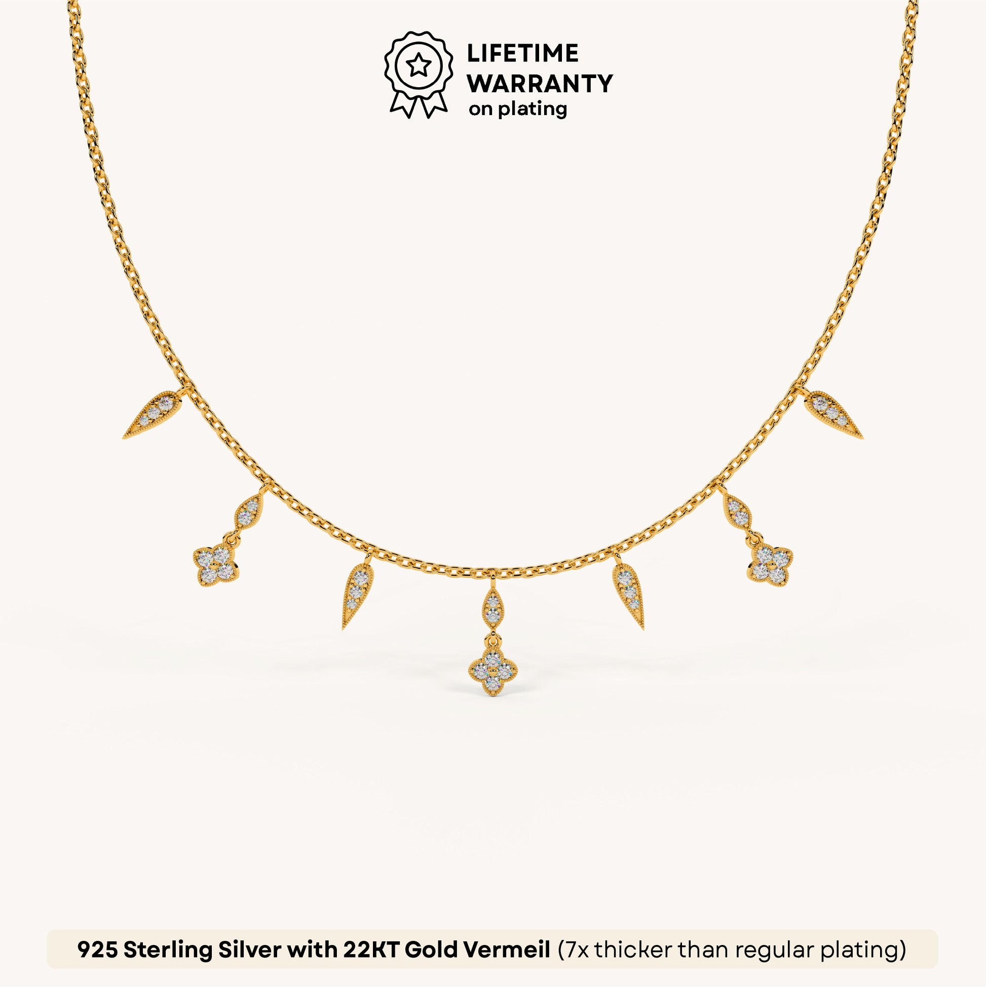 A striking mix of floral and teardrop charms create a rhythmic, luxurious appeal in this necklace. Crafted in 92.5 Sterling Silver, Plated 22k gold Vermeil with 7x thicker coating and studded with best 5A+ Austrian Zircon diamonds, it radiates timeless beauty with modern grace.