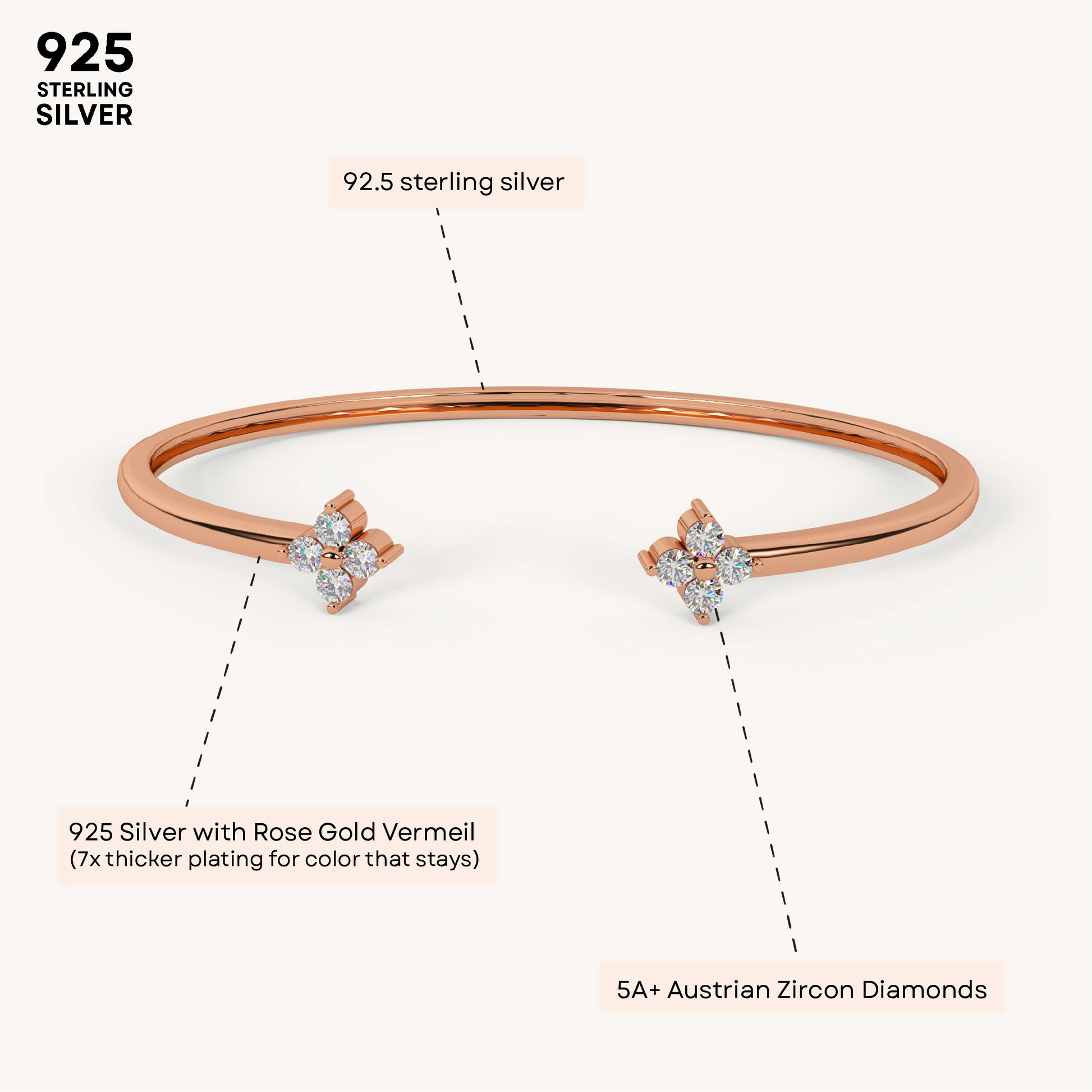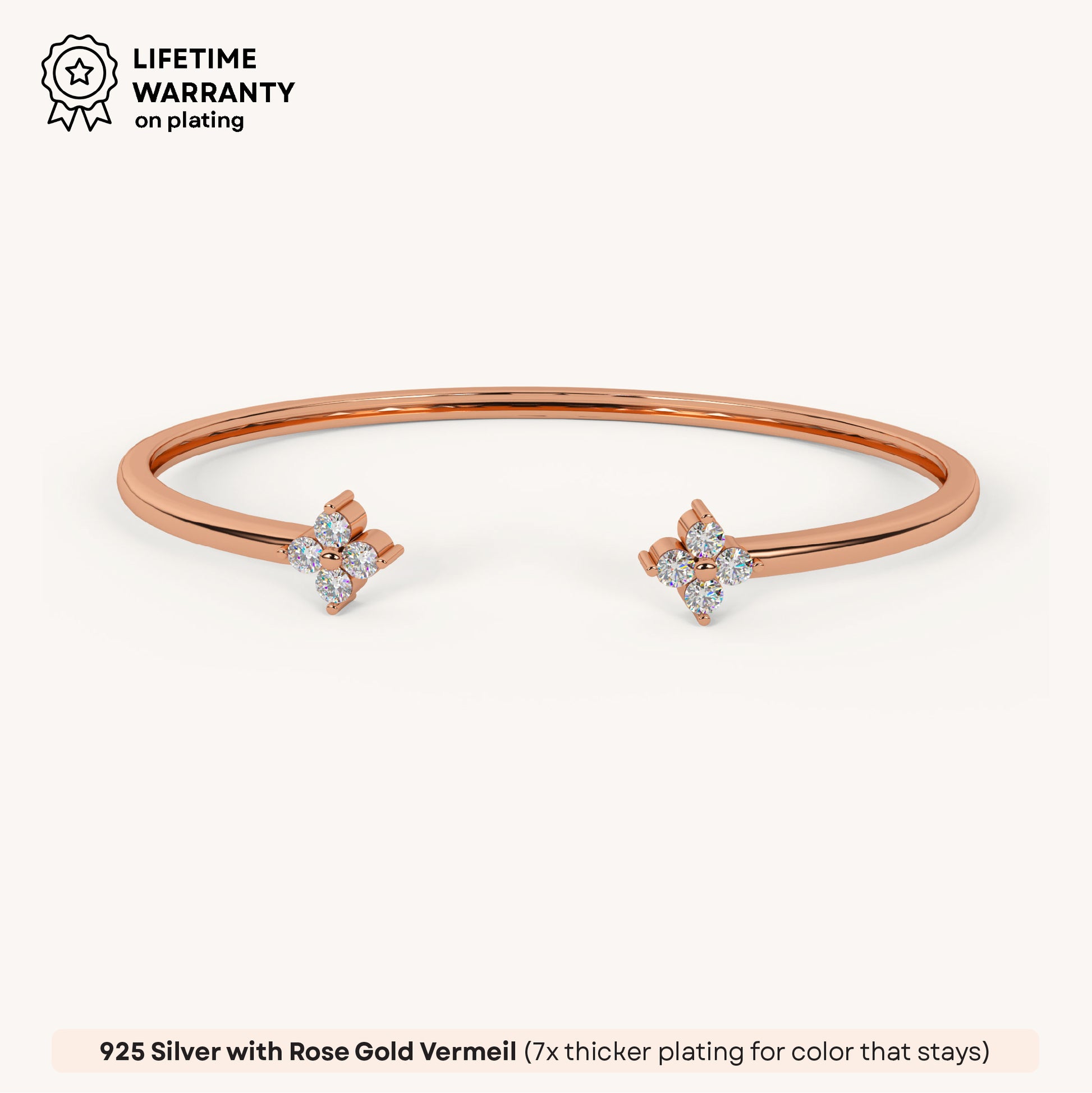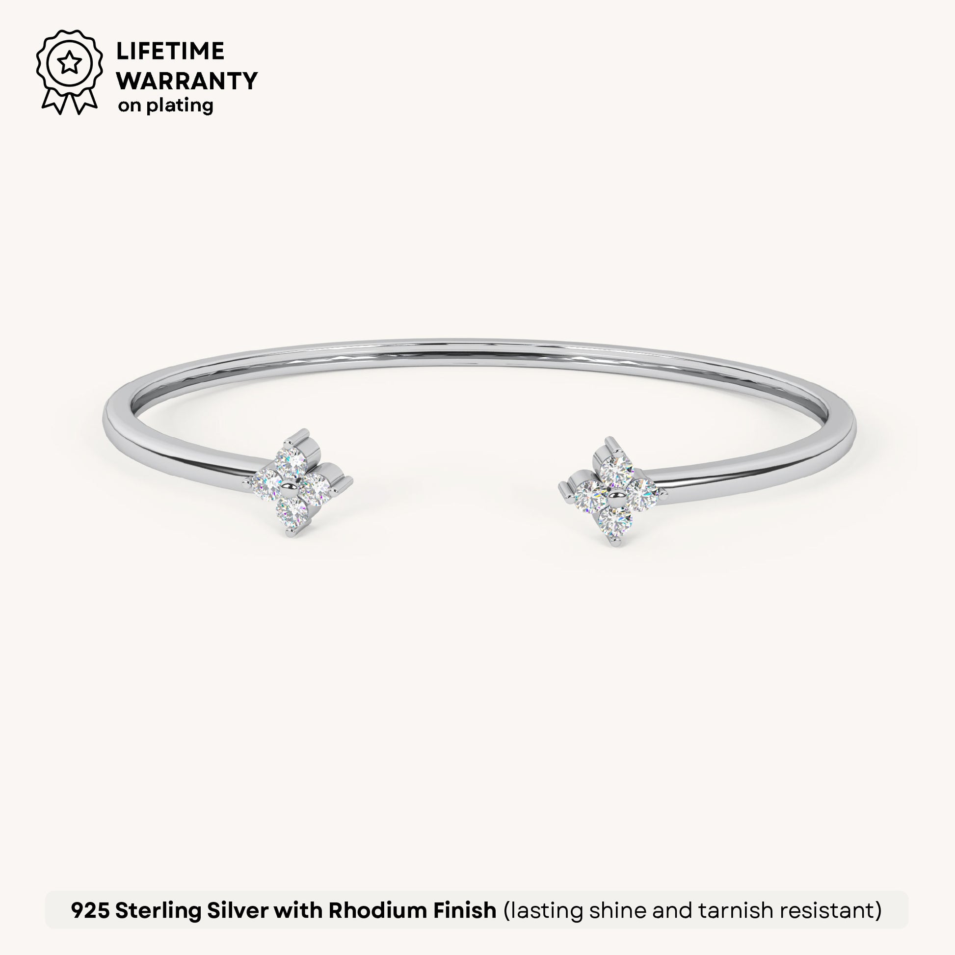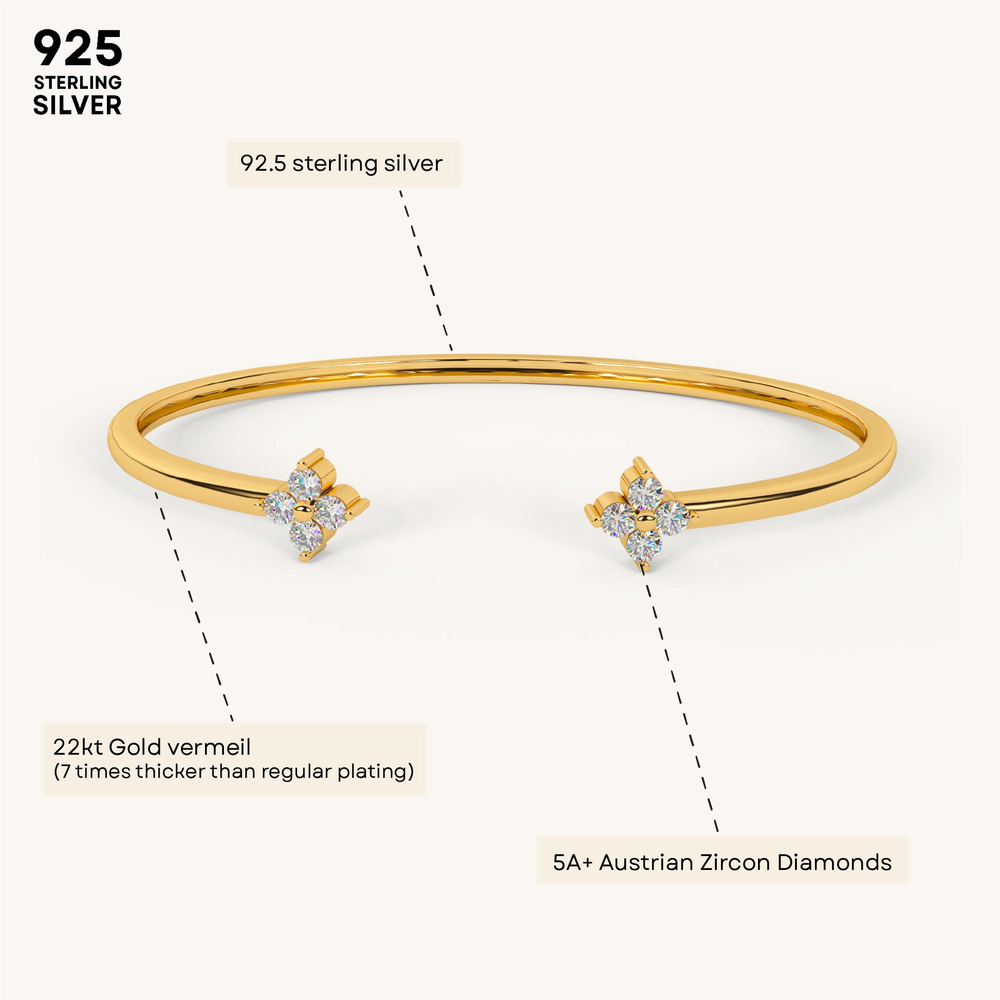 Zenith Clover Diamond Bracelet is a floral-inspired design with sparkling accents, adding a radiant touch to your style. Crafted in Sterling Silver, plated in 22K gold vermeil with 7x thicker coating and adorned with 5A+ Austrian Zircon diamonds.